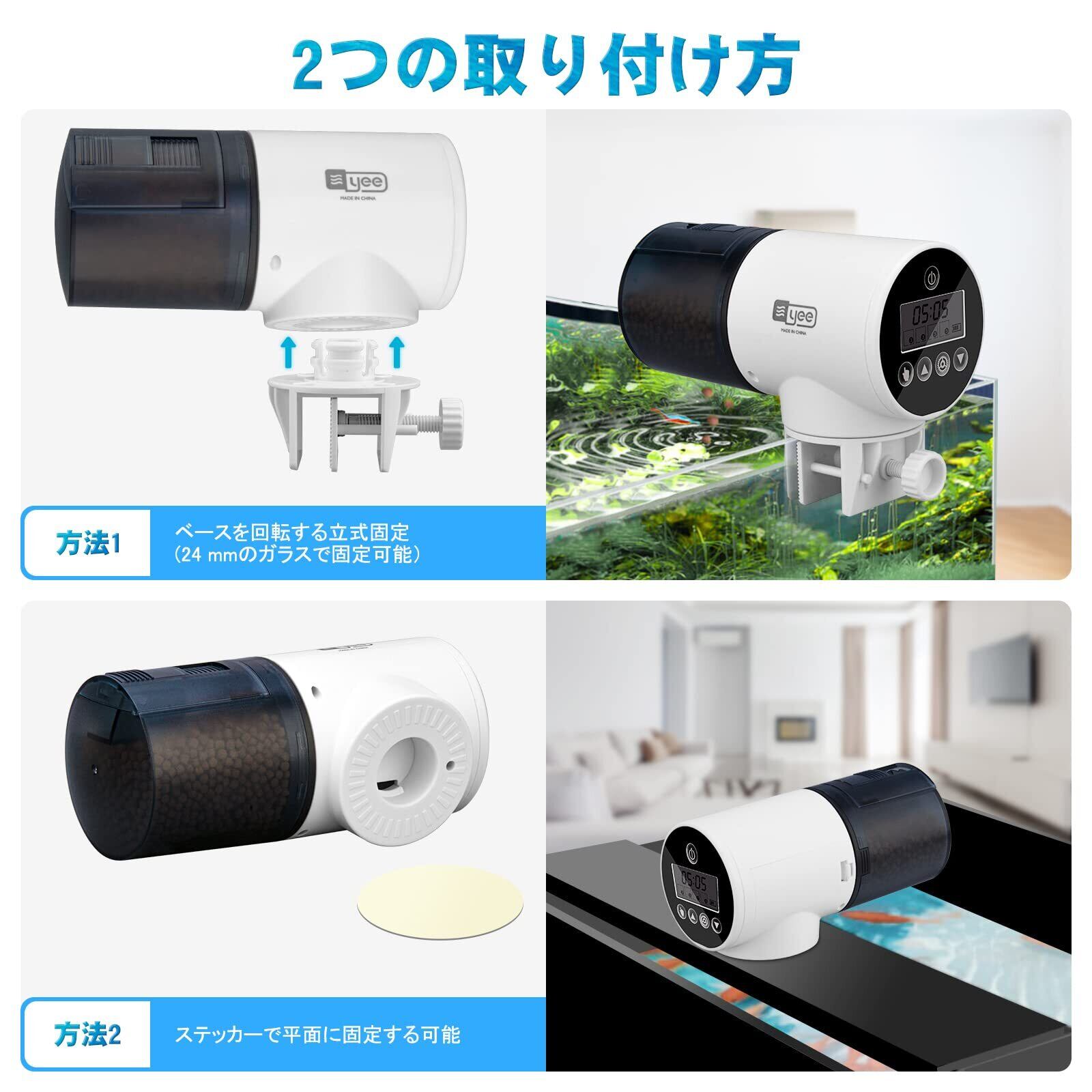 2つの取り付け方:設置もとても簡単です。水槽の様式によって、自動餌やり機の取り付け方が2つあります。水槽のフチにクランプで固定すれば簡単に設置可能。あるいは固定シールで据え置けます。注意:エサケースの餌を乾いた状態に保つために、フィーダーが水位を超えていることを確認してください。
