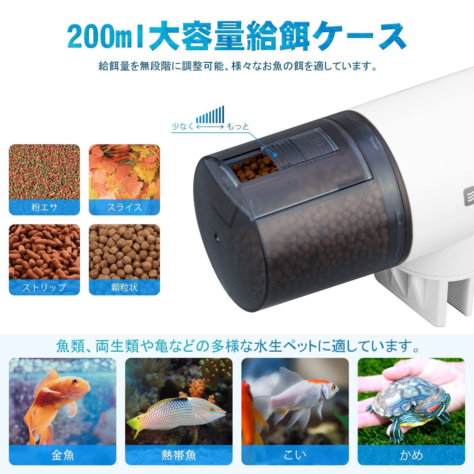 自動餌やり機:この魚自動給餌器はデジタルシステム制御、時間設定機能、液晶モニター表示、配線不要。注:充電式電池は使用しないで下さい。給餌量は一日中に4段階を設定でき、各段階には1-3回の餌を投入できます。給餌時間の設定が自由に変更できます。また、手動で餌を与え、餌の楽しさを体験することができます!