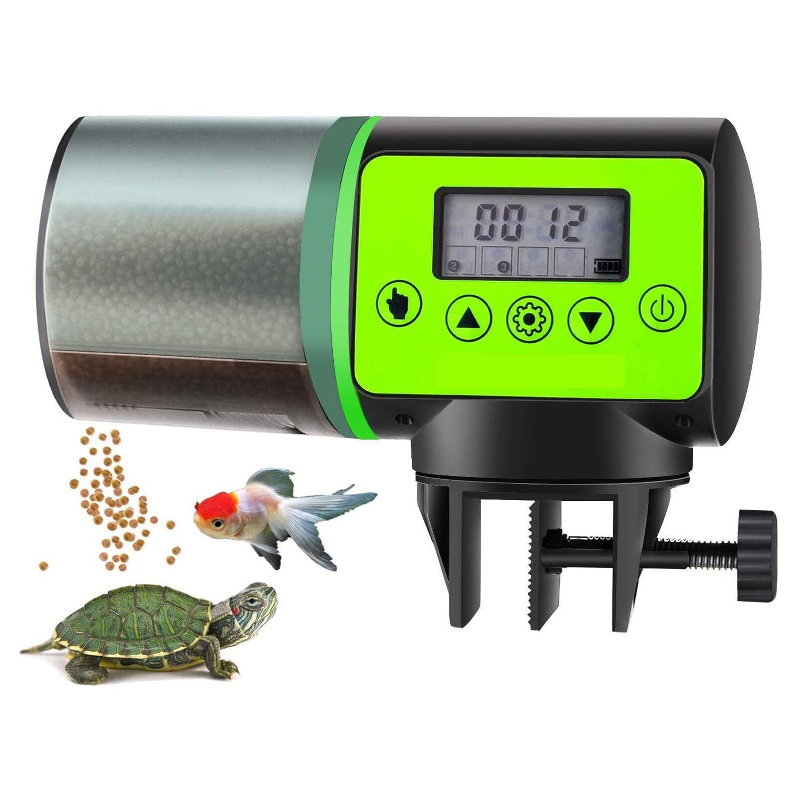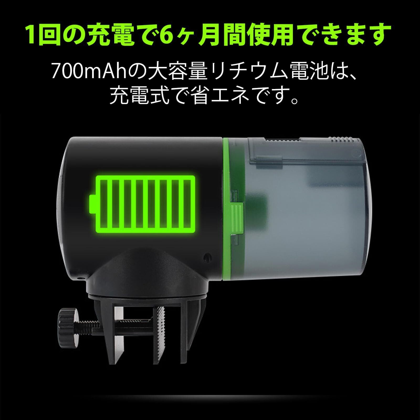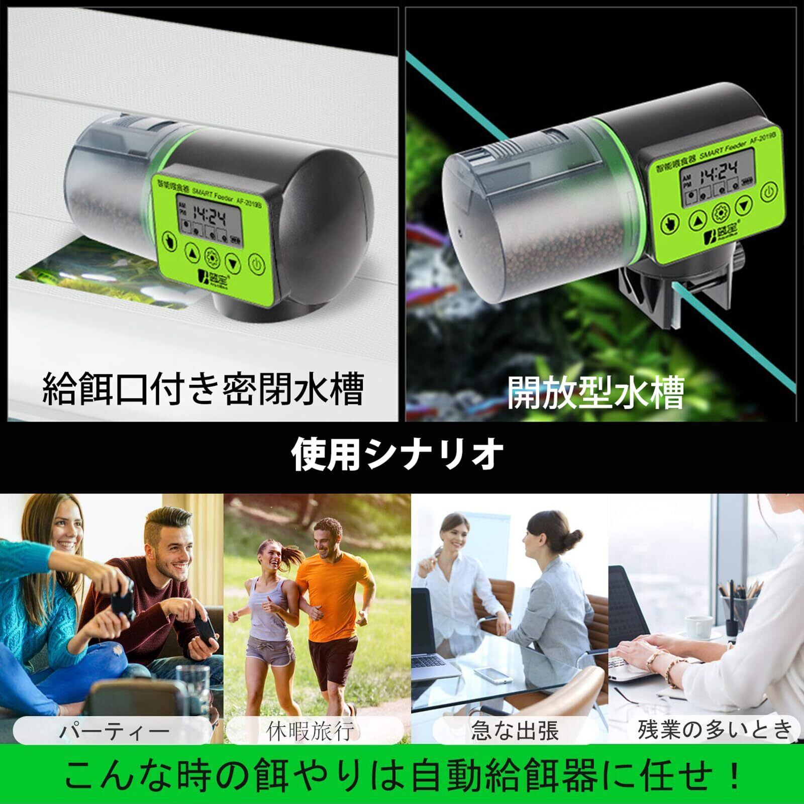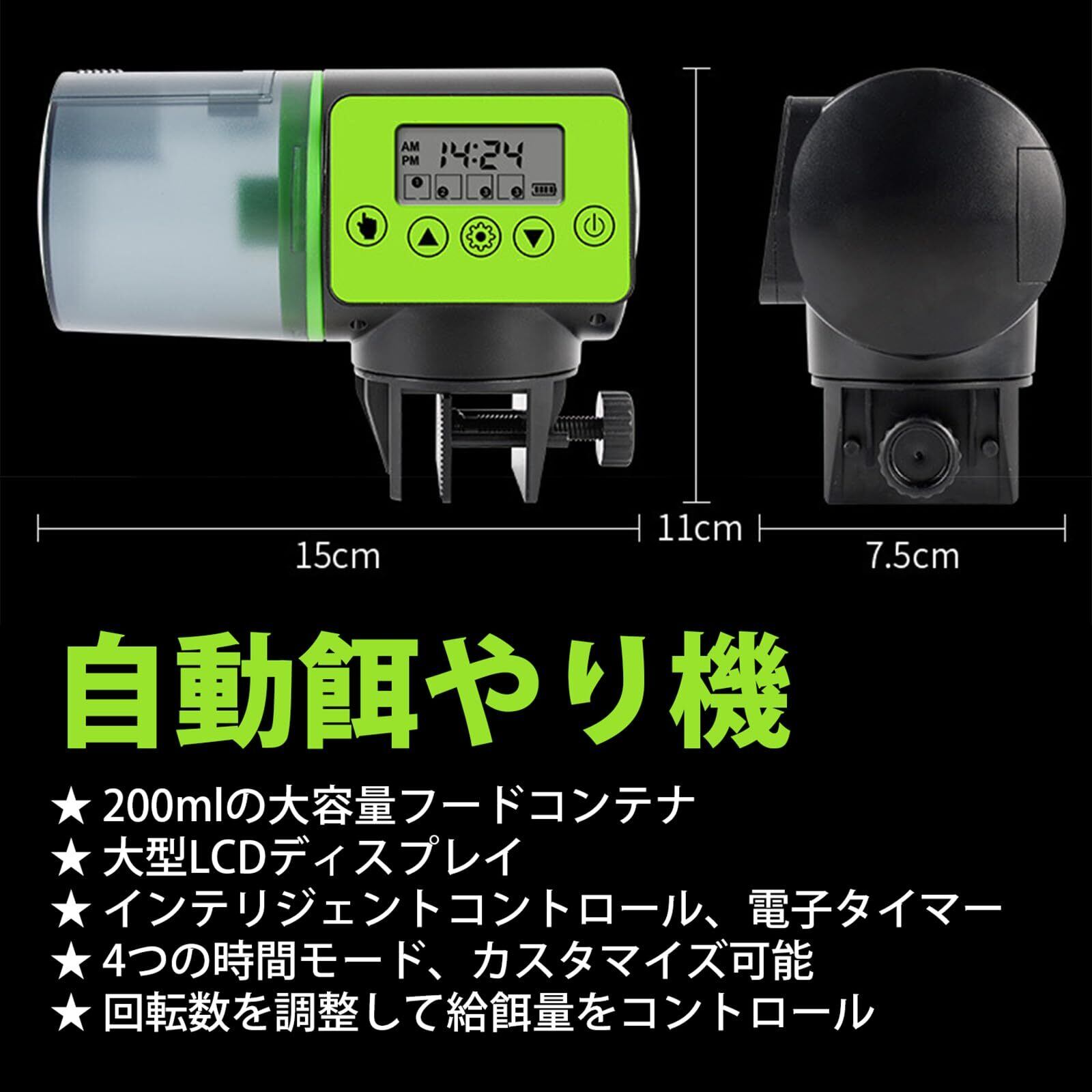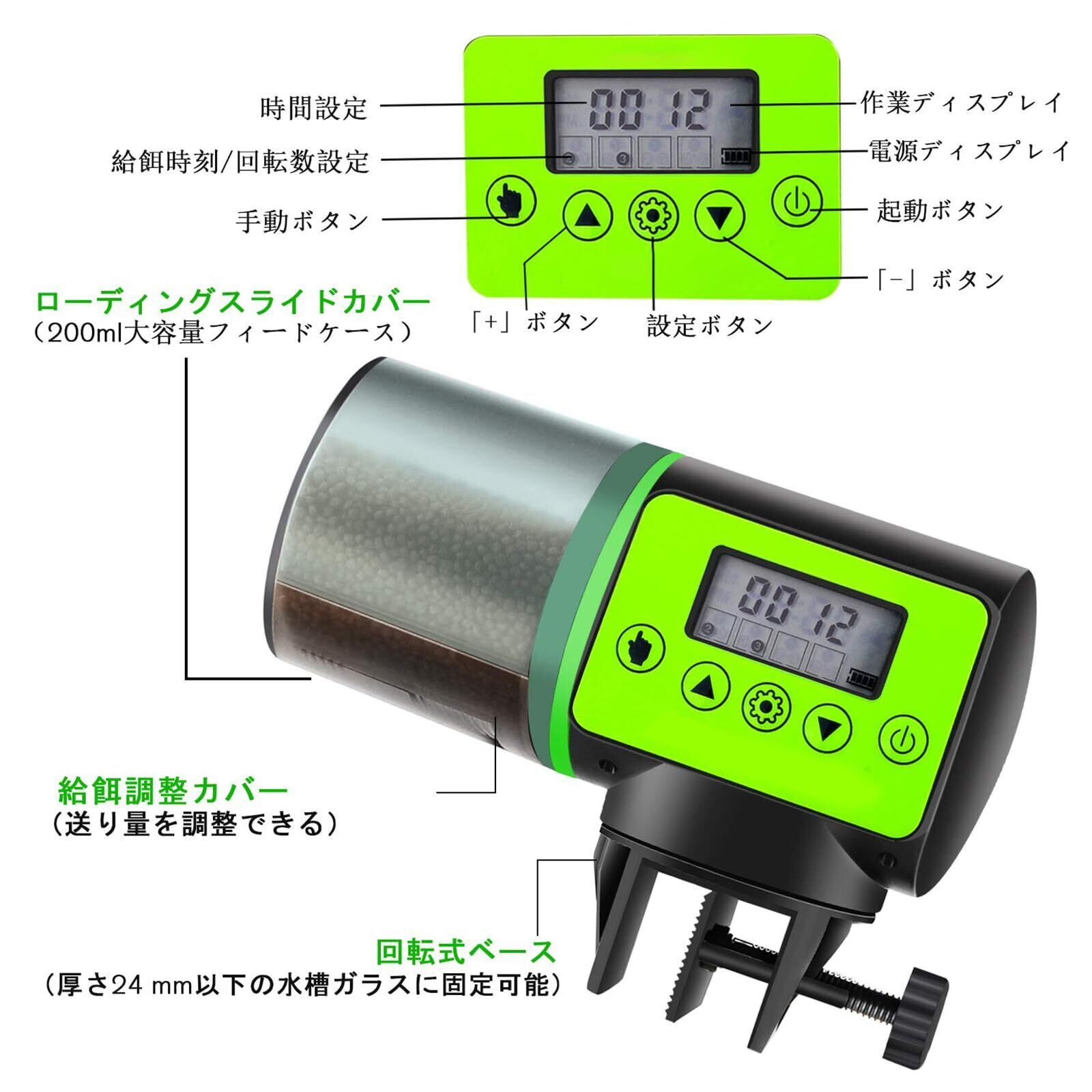 自動餌やり機:この魚自動給餌器はデジタルシステム制御、時間設定機能、液晶モニター表示、配線不要。注:充電式電池は使用しないで下さい。給餌量は一日中に4段階を設定でき、各段階には1-3回の餌を投入できます。給餌時間の設定が自由に変更できます。