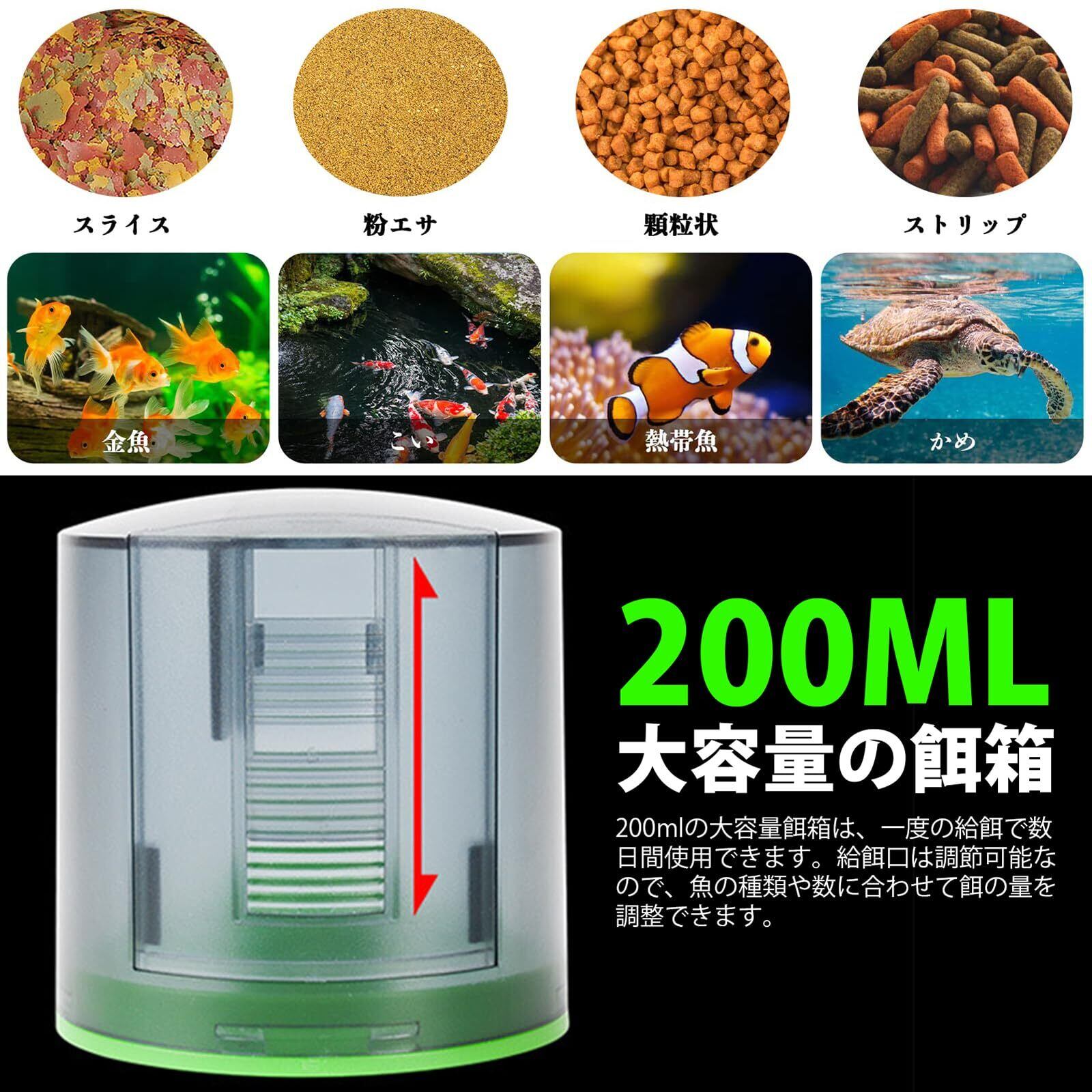 魚自動給餌器 自動餌やり機 熱帯魚 金魚 メダカ 360°回転&静音&湿気防止 オートフィーダー 定時 餌をやる 配給量調節可能 水槽 タイムフィーダー 多段階&多回転数 留守中の餌やり 2つの取り付け方 200ML