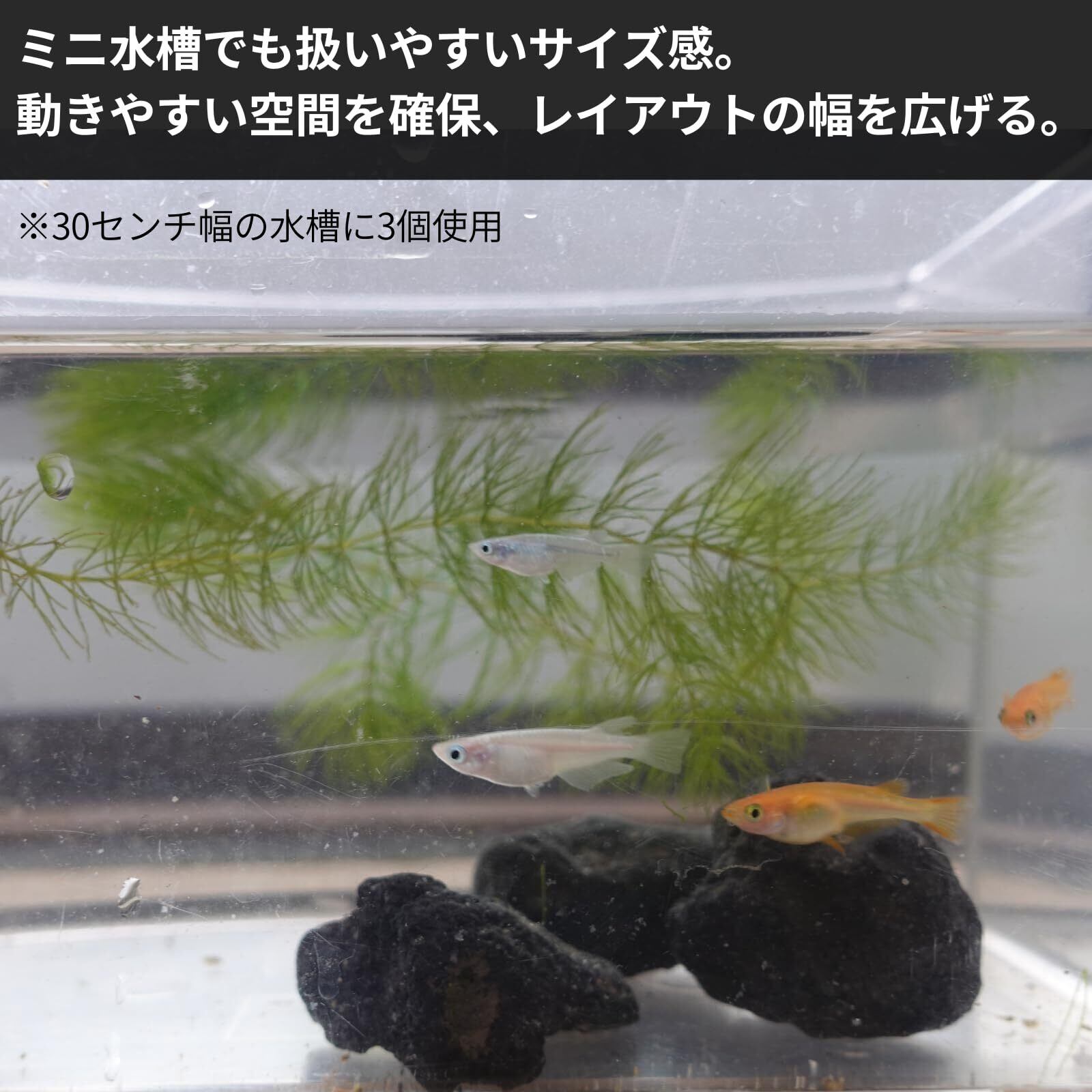 コンパクトでもレイアウト映えする:小ぶりながらも立体感があり、黒の質感が水草・流木・底砂と自然になじみます。レイアウトの主張はしすぎず、背景にも前景にも使える万能サイズです。
