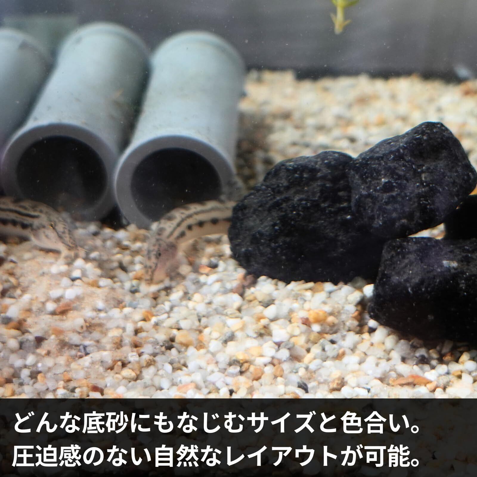 生体の邪魔をせず、ストレスなく泳げるサイズ:約20〜60mmの小粒サイズなので、生体の通り道をふさがず泳ぎやすい空間を保てます。狭い水槽でも圧迫感がなく、自然な景観を維持できます。