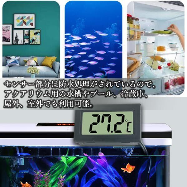 水槽、池等の水温、室温、冷蔵庫、冷凍庫等の温度管理に便利です。