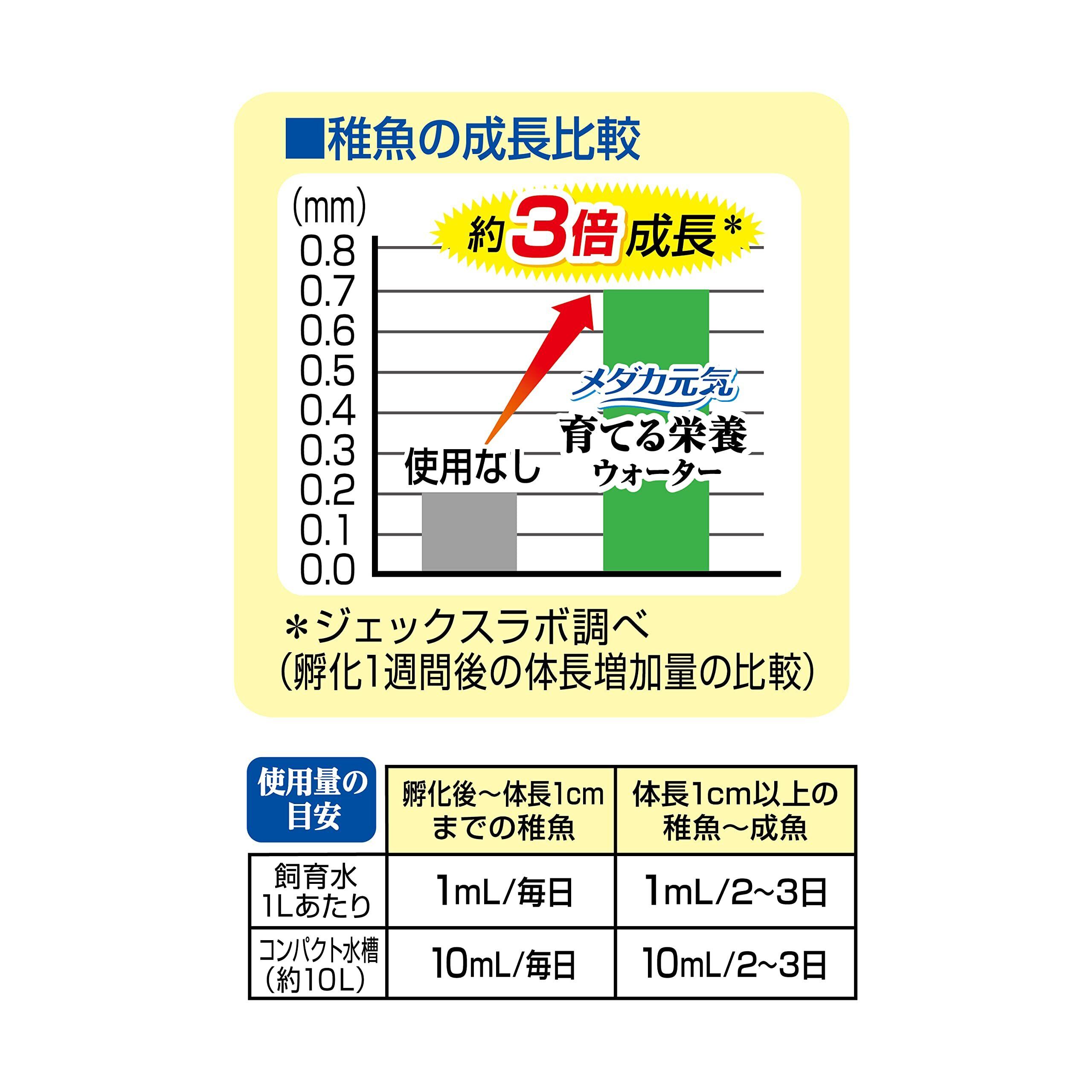 本製品は、餌から摂取しにくく、室内飼育や日照不足で充分な太陽光を浴びることのできないメダカに不足しがちなビタミンB3・B6・パントテン酸と各種ミネラル類を配合した、成長用栄養ウォーターです。