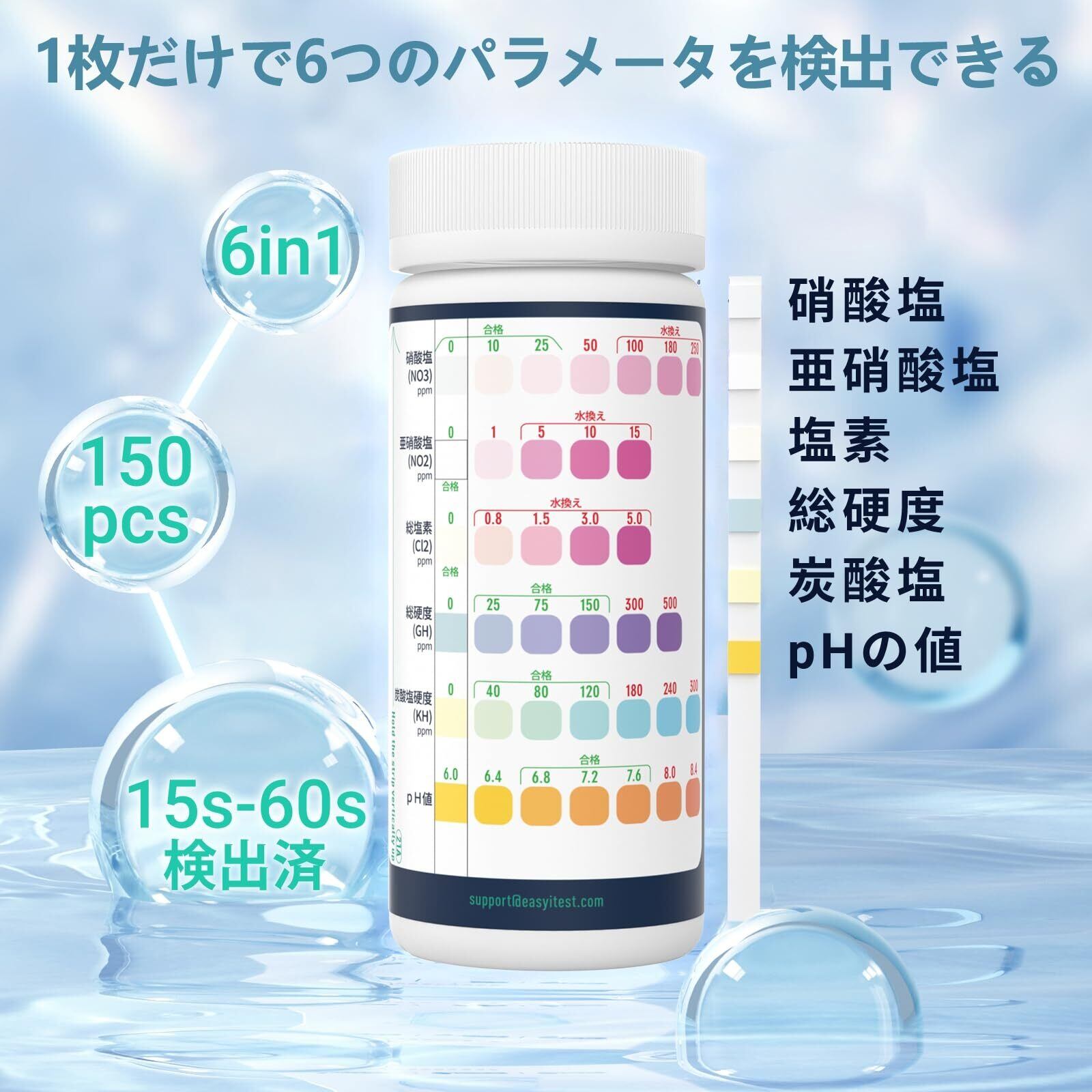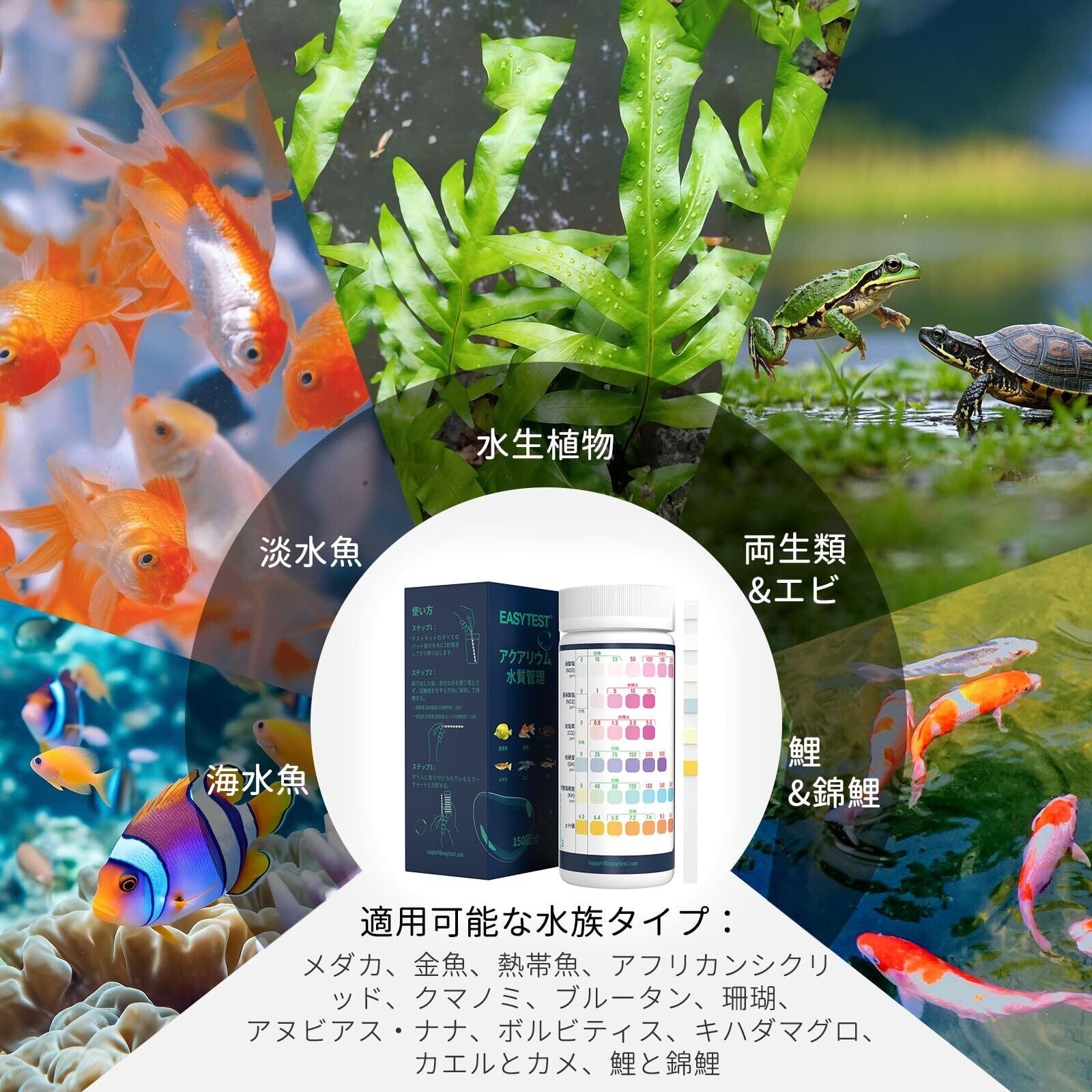 EASYTEST 水質検査キット 150本 アクアリウム 水質検査 水槽、魚タンク/淡水/池用 ,水質テストキット;硝酸塩、水の総硬度、Cl2、亜硝酸塩、炭酸塩そして PH 値6.0-8.4