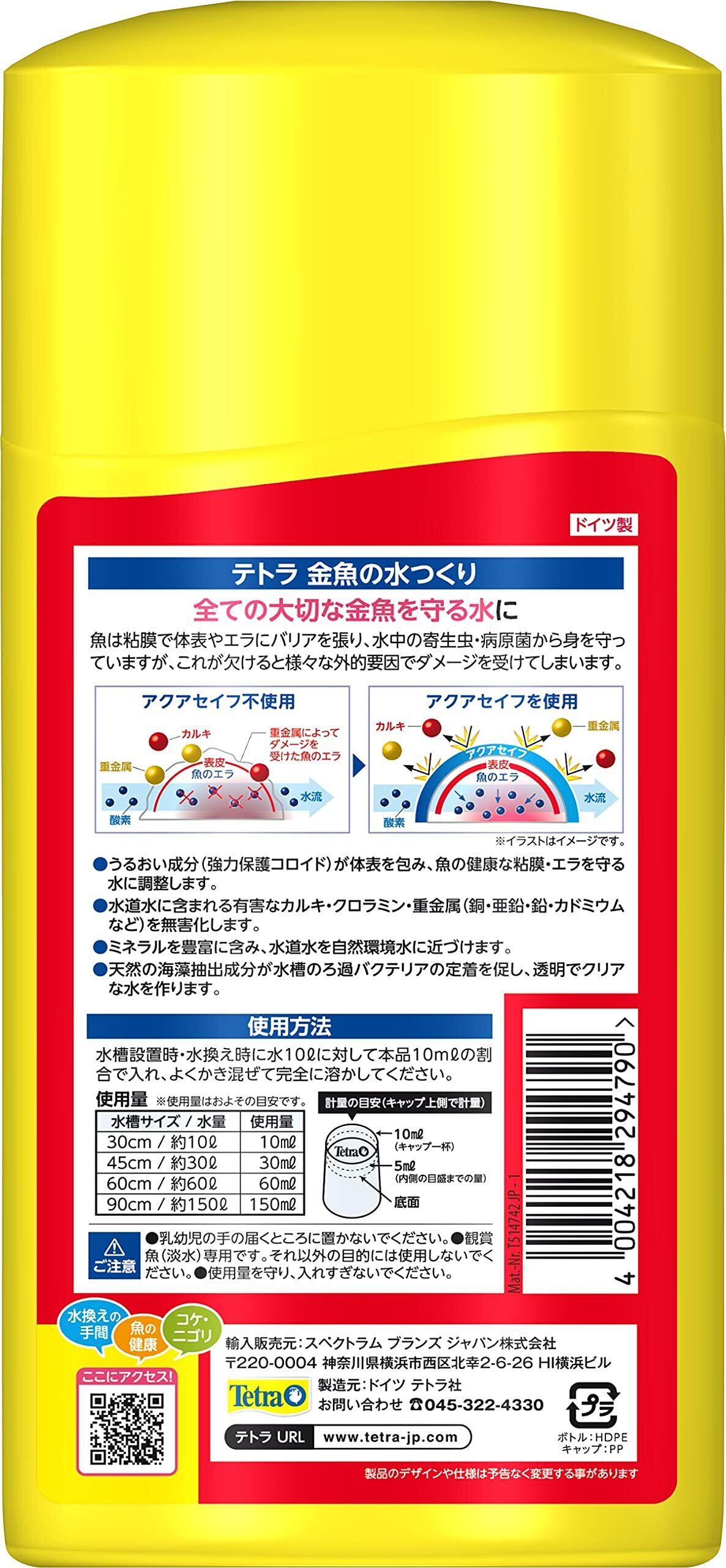 全ての大切な金魚を守る、うるおい成分配合カルキ抜き入り粘膜保護剤。○うるおい成分(強力保護コロイド)が体表を包み、メダカの健康な粘膜・エラを守る水に調整します。○水道水に含まれる有害なカルキ(塩素)・クロラミン・重金属(銅・亜鉛・鉛・カドミウムなど)を無害化します。○ミネラルを豊富に含み、水道水を自然環境水に近づけます。○淡水用