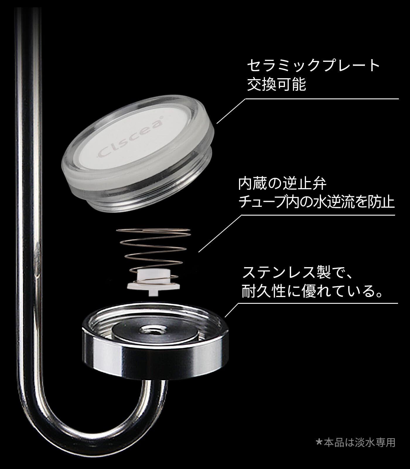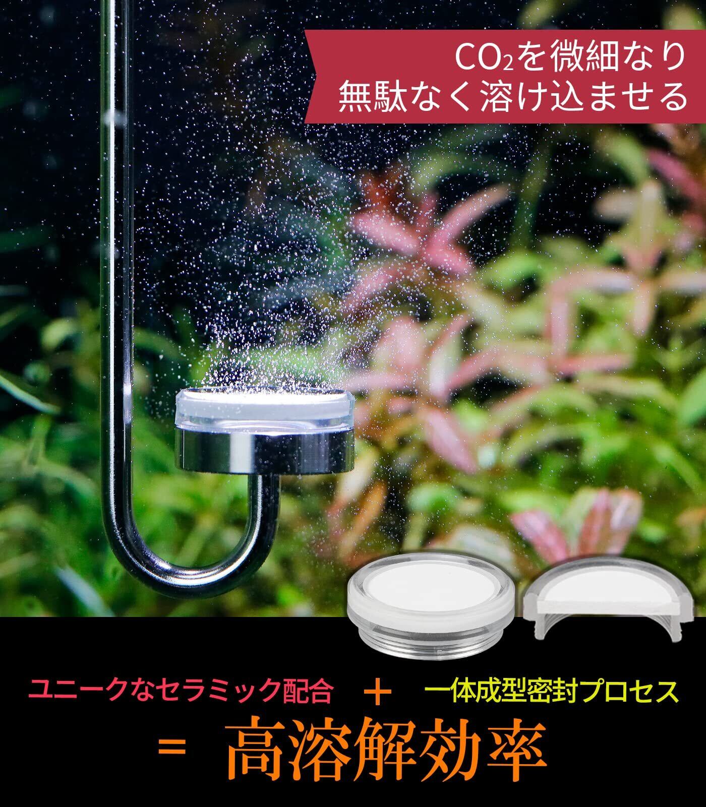 【細かい気泡】:独自のセラミック加工技術で、エア量に関係なく均一な霧化を実現。高溶解率で水草の栄養吸収を促進!