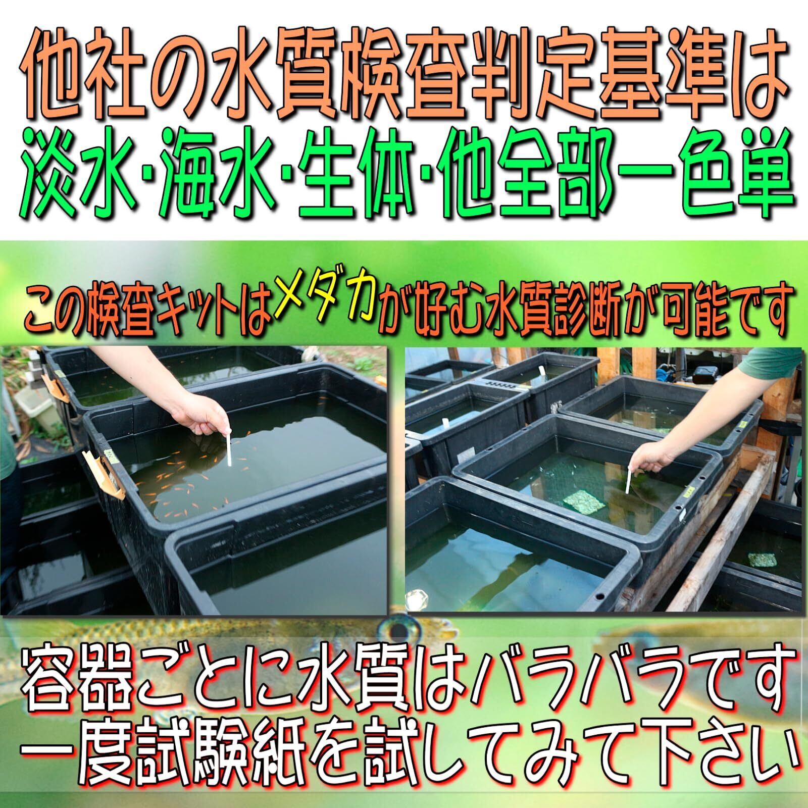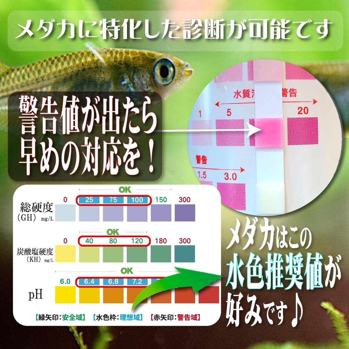 ■この試験紙はメダカ専用に開発された初の水質検査キットです。メダカの水質検査が簡単に実施できます。メダカ 水槽、メダカ鉢、ビオトーブなどの飼育水における水質、総硬度 (GH) 硝酸塩 (GH) 亜硝酸塩 (NO2) 塩素 (CL2) 炭酸塩硬度 (KH) PH (ペーハー)が1.2分程度で検査が可能です。