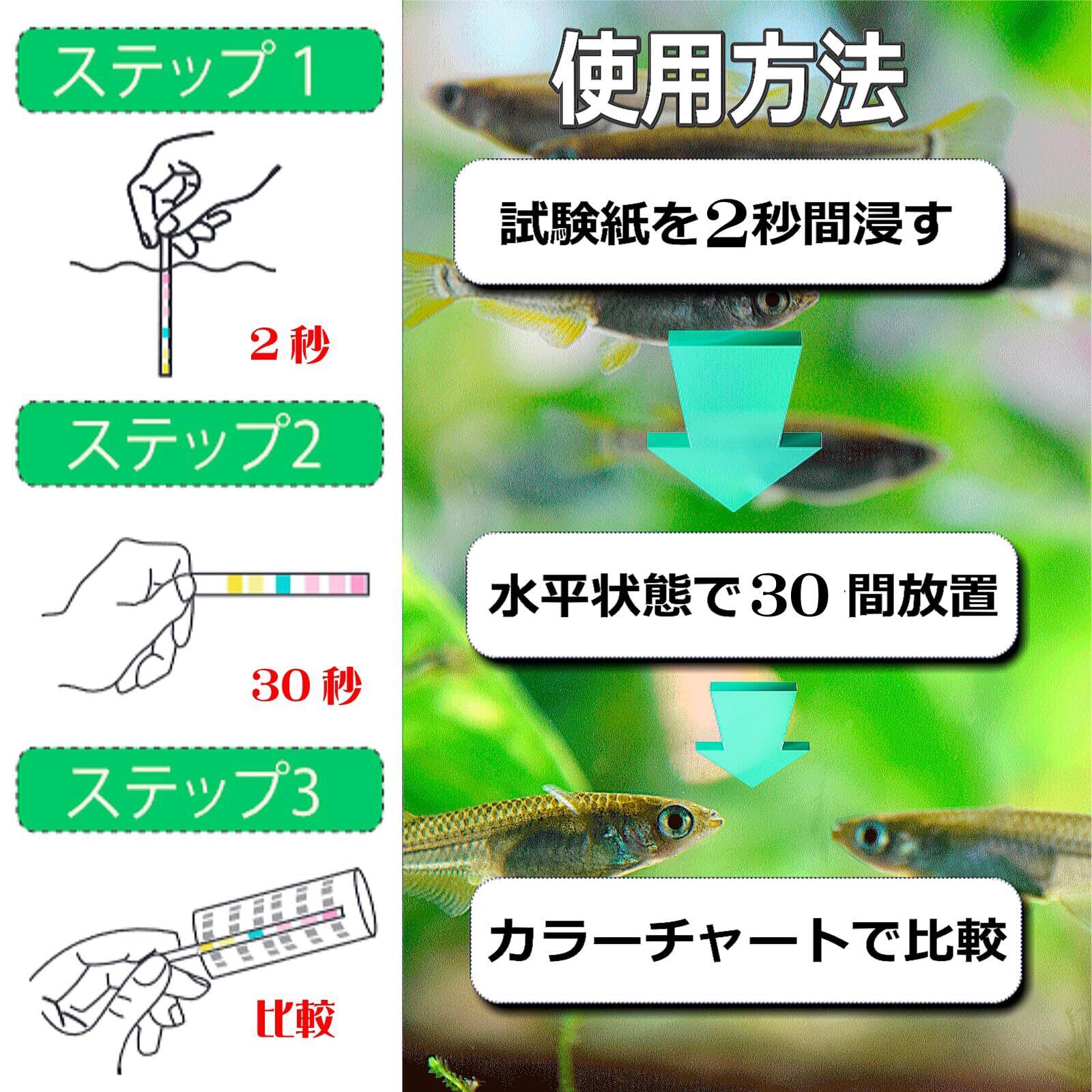 ■正確な検査結果を得るため、説明書の指示に従ってご使用ください。 ・カラー診断時は、水槽用の強いライトの直下を避けてください。 ・試験紙は2秒間浸した後、付着した水分をしっかり振り落としてください。 ・湿気を避け、キャップをしっかり閉めて保管してください。