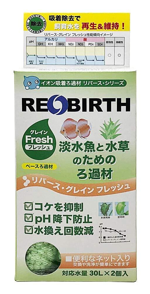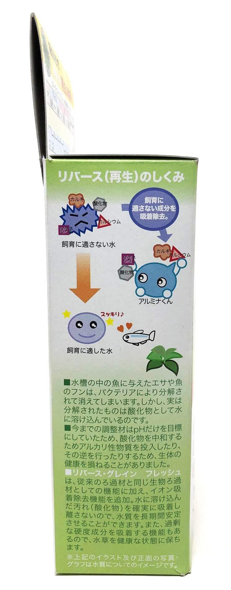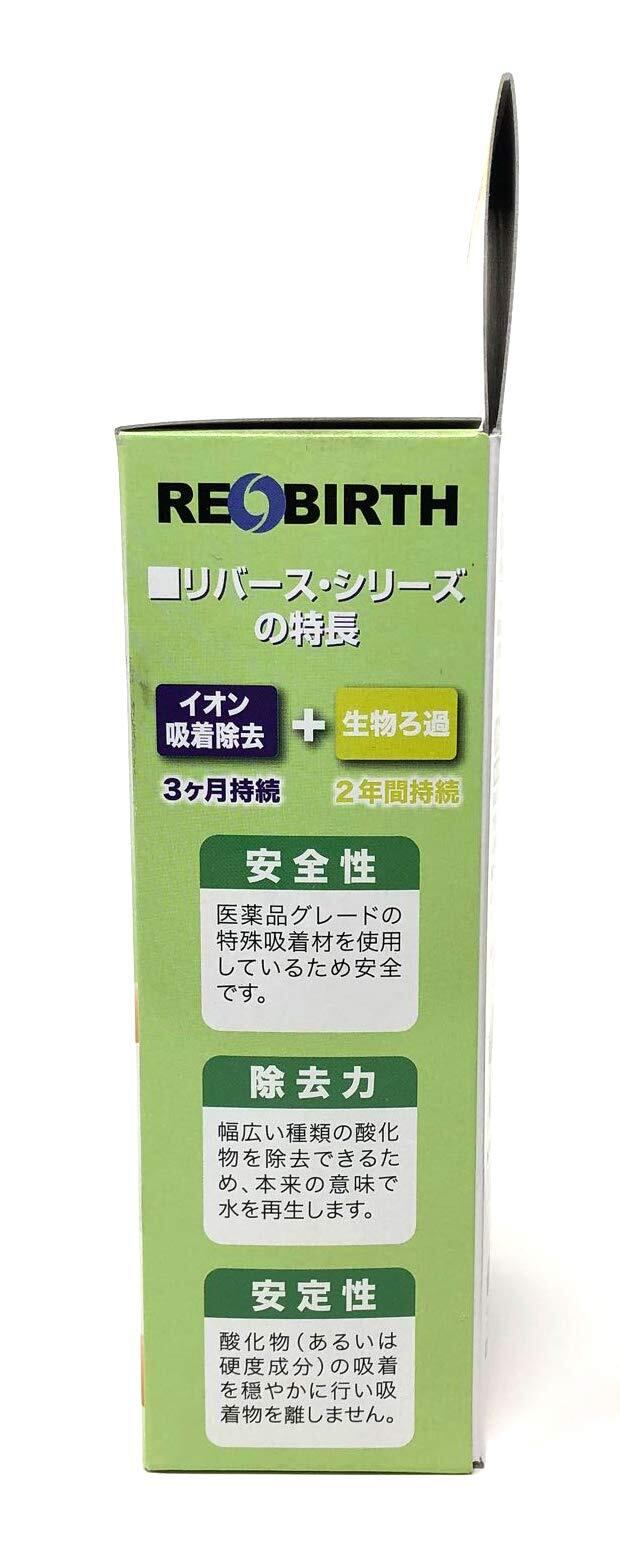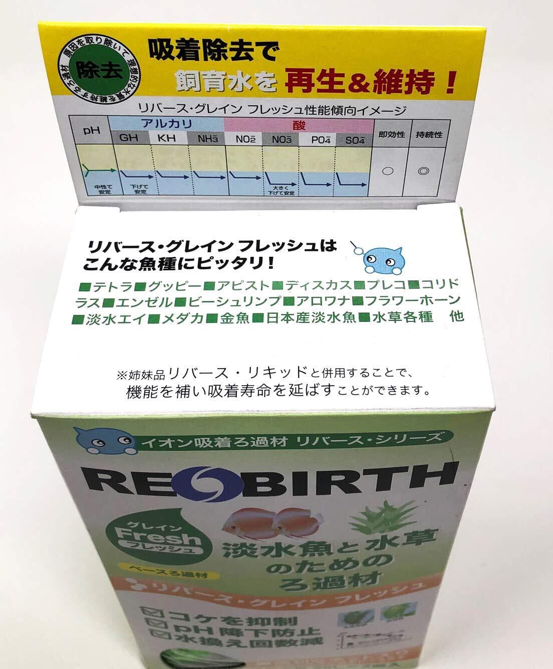 pHの数値を合わせただけでは水質管理はうまくいきません。pHは酸性分とアルカリ成分のバランスの指標であり、それぞれの成分の量の指標ではないためです。飼育水にこれらの成分が増えると、魚や水草の調子が悪くなり、コケが大量発生しやすくなります。従来の水質調整剤は例えばpHを調整するにあたり、成分を加える調整剤でした。リバースは取り除くという方法によりpH等の水質の数値を調整する画期的な調整剤です。過剰な硬度成分を除去し(GH2前後)軟水にします。イオン吸着力により蓄積する酸化物(硝酸塩・リン酸・ケイ酸・塩素化合物・硫酸化合物)と過剰な硬度成分を総合的に除去し、水替えの時期を延ばすことができます。コケを抑え魚や水草が健康に育ちます。バクテリアが繁殖しやすくアンモニア・硝酸塩を分解、吸着します。イオン吸着除去は約3-6か月、生物ろ過材としては約2年の長期使用が可能です。