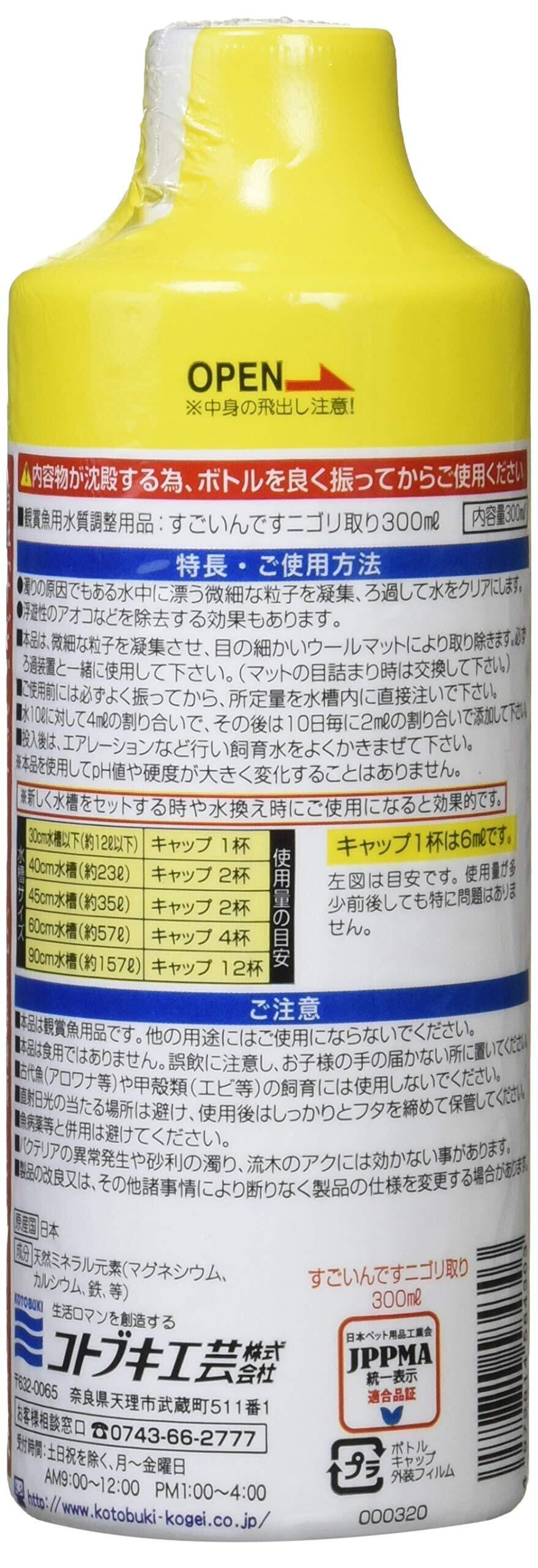 お得用300mlが新登場! ニゴリを瞬間除去! ○濁りの原因でもある水中に漂う微細な粒子を凝集、ろ過して水をクリアにします。○浮遊性のアオコなどを除去する効果もあります。