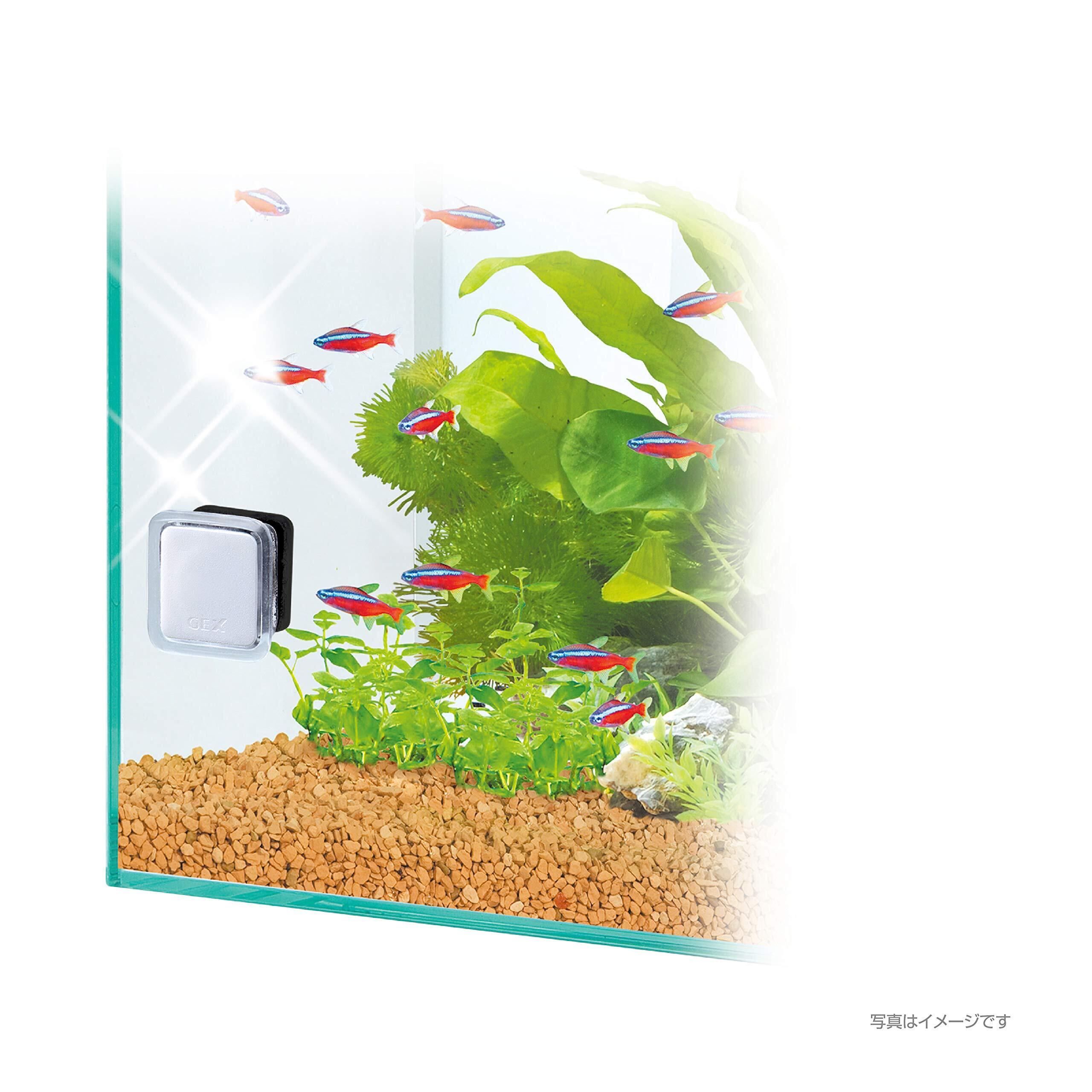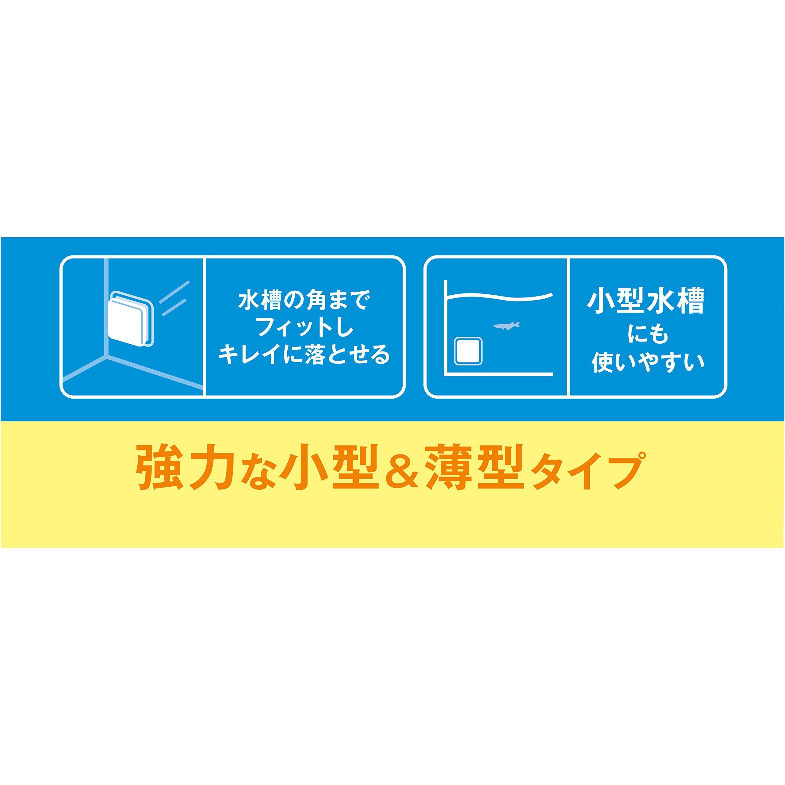 強力な小型&薄型タイプのマグネットクリーナー! 浮く!平面適合タイプ フラットブラシで汚れを強力に落とせる。 水槽の角までフィットし、キレイに落とせる! 小型水槽にも使いやすい! 内側部分にフラットなしっかり素材を使用しているので、磁力が均一に伝わり、汚れをきれいに落とせます。 ●ライトやフタをセットしたまま、手を濡らさずにガラスのコケや汚れを落とすマグネットクリーナーです。 ●強力ネオジム磁石の力で、しつこい汚れも簡単に落とせます。 ●小型&薄型タイプなので、底砂付近のガラス面やフィルター等の隙間など、今まで掃除が行き届かなかった細かい部分のコケもお掃除することができ、レイアウト水槽にも最適です。 ●内側部分は水に浮くので、誤って磁石が外れてしまっても水槽の底に落下せず、簡単に再セットすることができます。 <ご使用方法>本体のうち黒い方を水槽内に入れ、白い方で水槽外側からガラスを挟み込み、外側の方を動かして使用します。 適合水槽:ガラス厚6mmまで(一般的な60cm水槽にも対応) 製品サイズ:約幅3.5×奥行3.5×高さ1.8cm