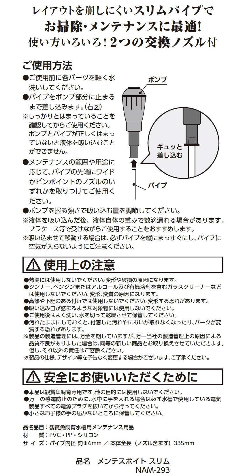 お掃除やメンテナンスに最適。スリムパイプだからレイアウトを崩しにくい。ピンポイント用とワイド用のノズル付きで交換可能です。
