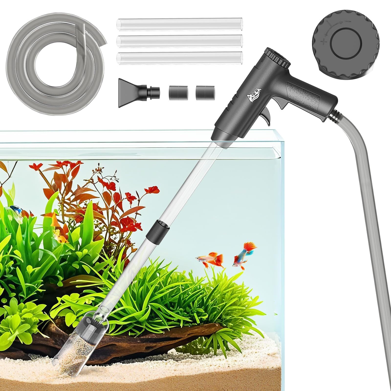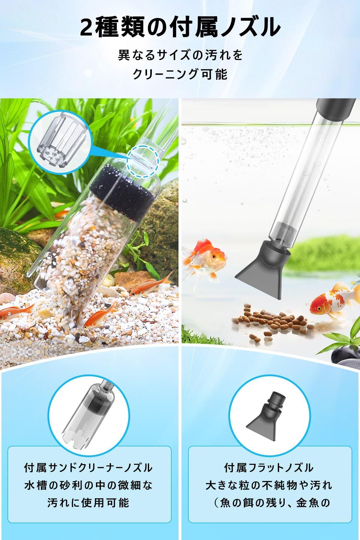 【シンプルかつ効率的な砂利掃除&水換え】 AQQAの手動式水槽用水換えポンプは、水換え・砂利洗浄・汚れ掃除を一体化した多機能タイプで、日常のアクアリウム管理を簡単にします。本製品には2種類の専用ノズルが付属しており、用途に応じて使い分けが可能です。砂利掃除ノズルは、水槽の底砂に混ざった微細な汚れを効果的に吸い出すことができ、内部のフィルタースポンジにより、レイアウト用の砂利や石が吸い込まれるのを防止します。一方、吸水ノズルは、底に溜まった餌の食べ残しや魚のフンなど、大きなゴミをしっかりと吸引可能です。水流は調整可能で、効率よく水換え・清掃作業を進められるため、面倒な水槽メンテナンスをよりスムーズに行えます。