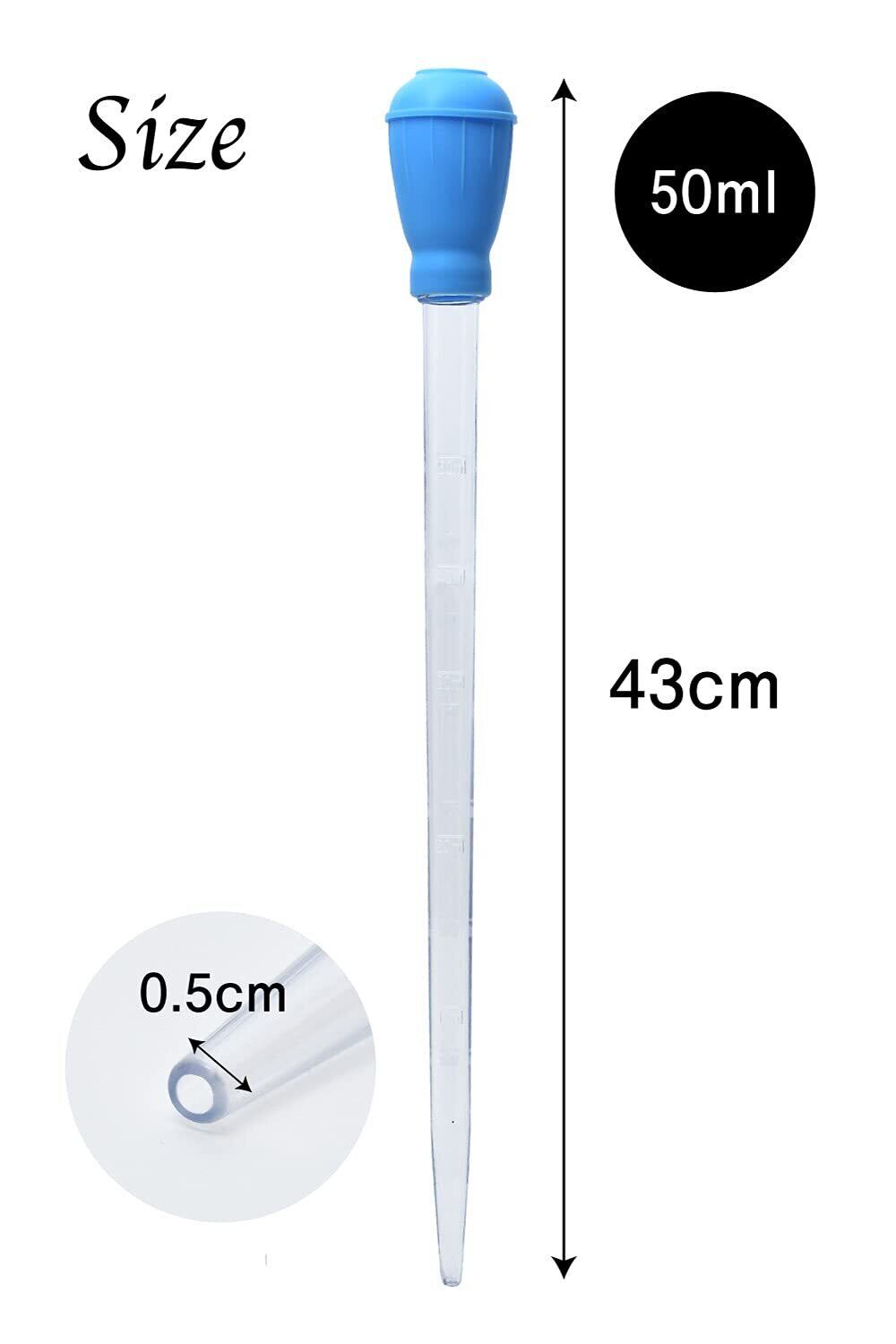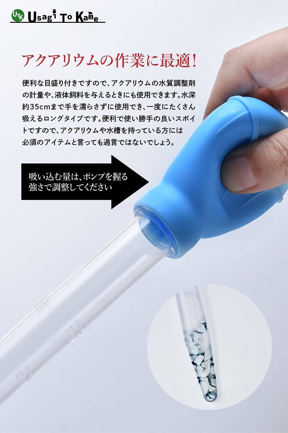大容量50mlのロングタイプ!便利な目盛り付きで、アクアリウムの水質調整剤の計量や、液体飼料を与えるときにも使用できます。水深約35cmまで手を濡らさずに使用でき、一度にたくさん吸えるロングタイプです。