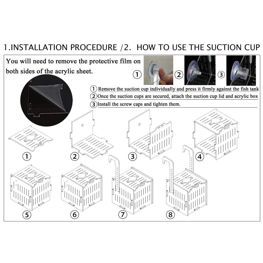 【高透過率】透明なので、隔離された魚の状態をはっきり観察することができます。家族や子供と一緒に魚の成長過程を観察して、魚の成長過程を知ることができます。アクリルボックスは取り外しや組み立てが自由で、清掃も簡単です。に注意:製品の外層には保護膜が付いている,使用前に表面の膜を除去してください。