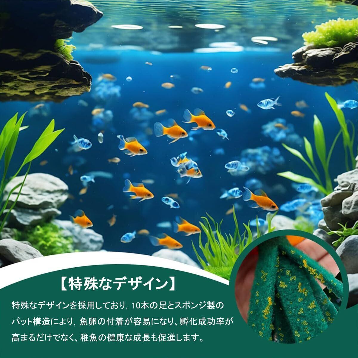 【特殊なデザイン】特殊なデザインを採用しており,10本の足とスポンジ製のパット構造により,魚卵の付着が容易になり、孵化成功率が高まるだけでなく、稚魚の健康な成長も促進します。複雑な設置は不要で、簡単なスポンジパットの挿入だけで設定が完了します。