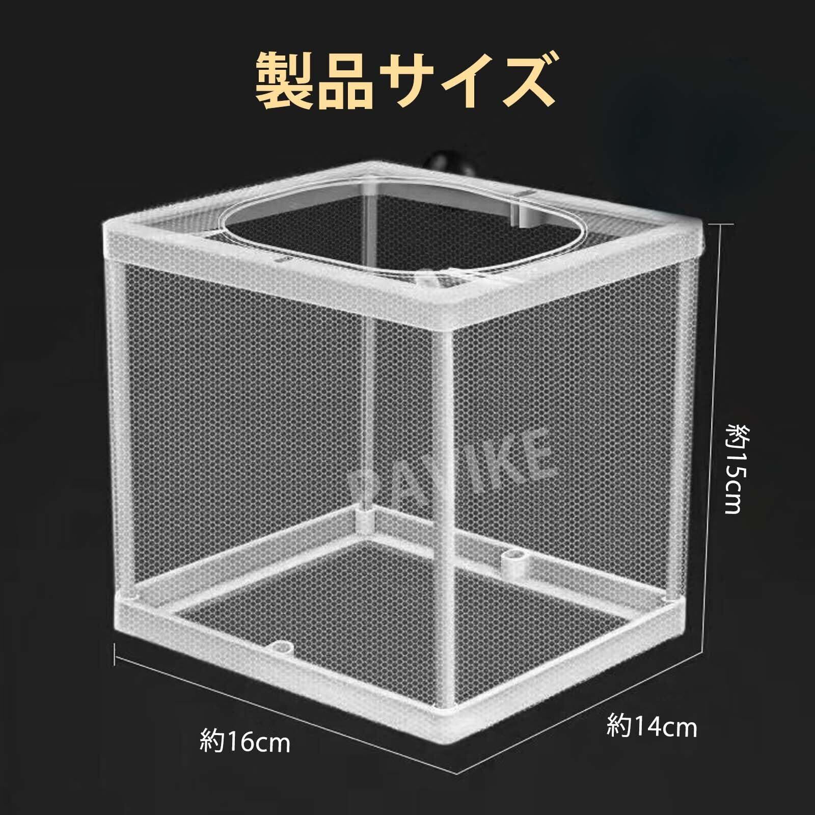 【包装】稚魚隔離ケースを受け取ります,サイズ基準は約16*15*14 cmで、吸盤が付いていて、多種の魚を収容することができます。また、小さな穴が魚の網漏れを防止し、魚を観察するのに便利です。細密な網目は稚魚を保護し、水の循環をすることができる。