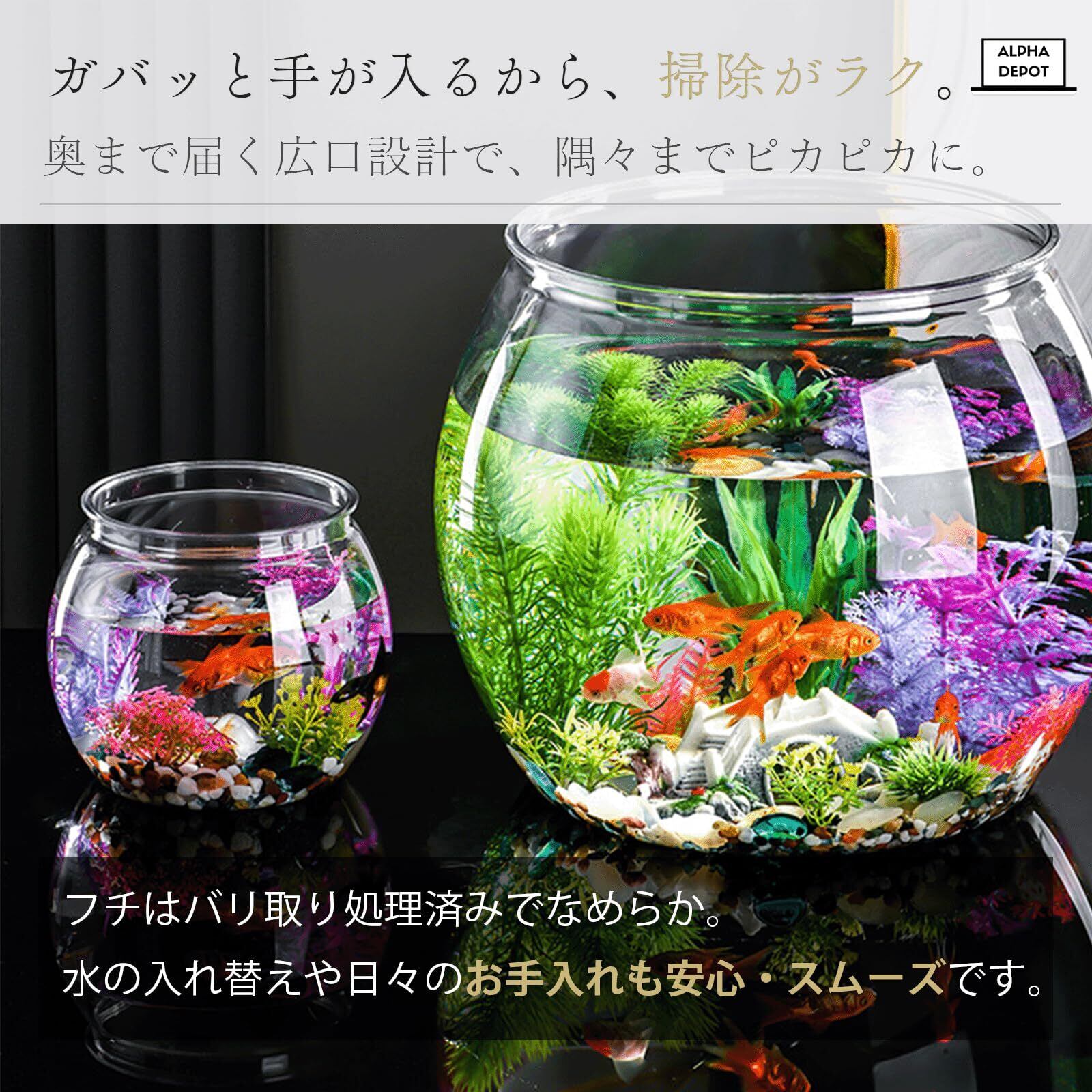 【広い入口でお手入れ簡単】開発段階から広口設計にこだわり、手が底まで届くため、掃除がラクラク。さらに、安定感のあるサイズで倒れにくく、安全に使用できます。水の入れ替えやレイアウトの変更もスムーズにできるので、長く快適にお使いいただけます。