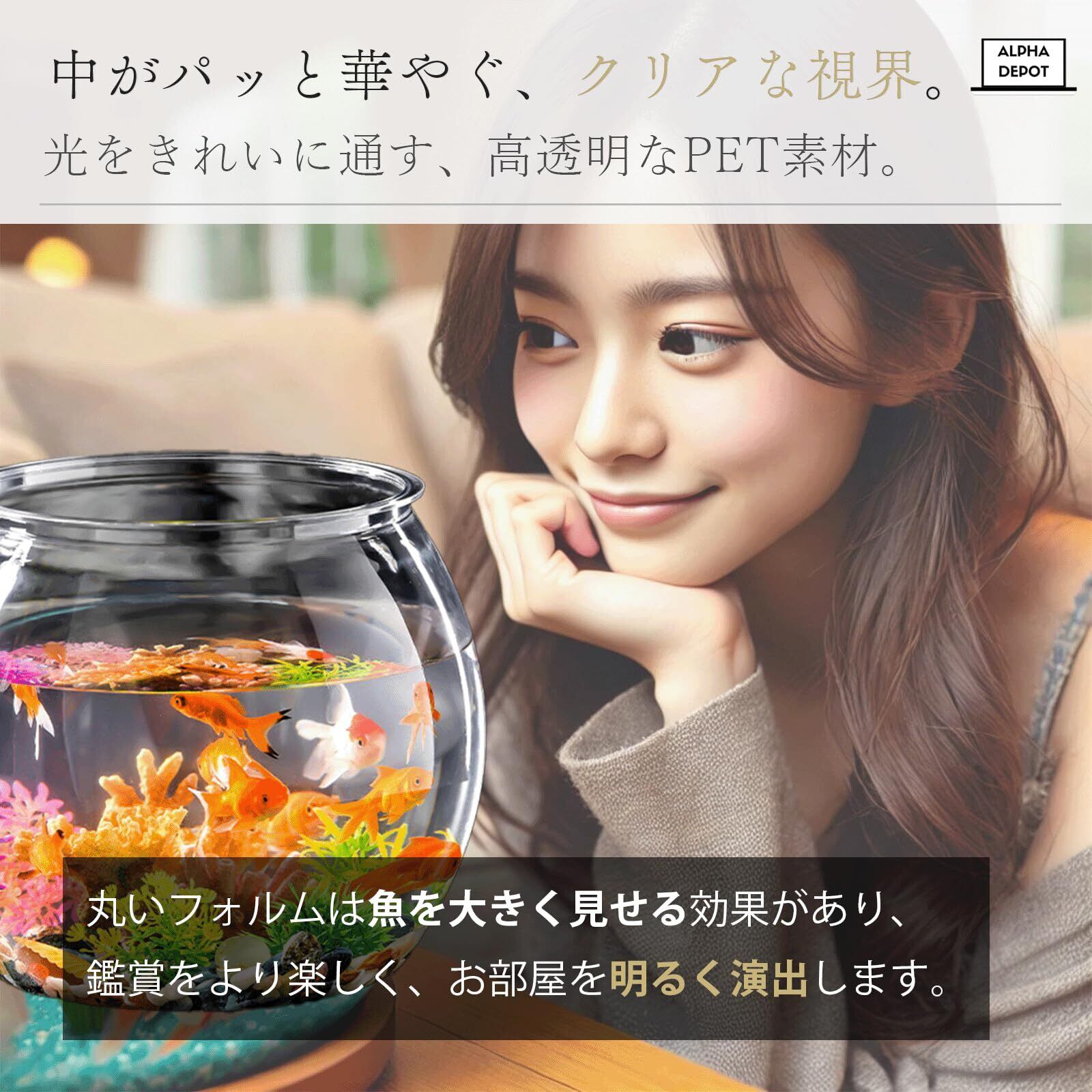 【透明度が高い素材で美しさを演出】高透明度のPET素材を使用し、光をたっぷり通すことで、水中の植物や生き物をより美しく魅せます。滑らかな丸型フォルムは、お部屋のインテリアにも馴染みやすく、おしゃれな空間を演出。水耕栽培や観賞魚の飼育にも適した多用途なデザインです。