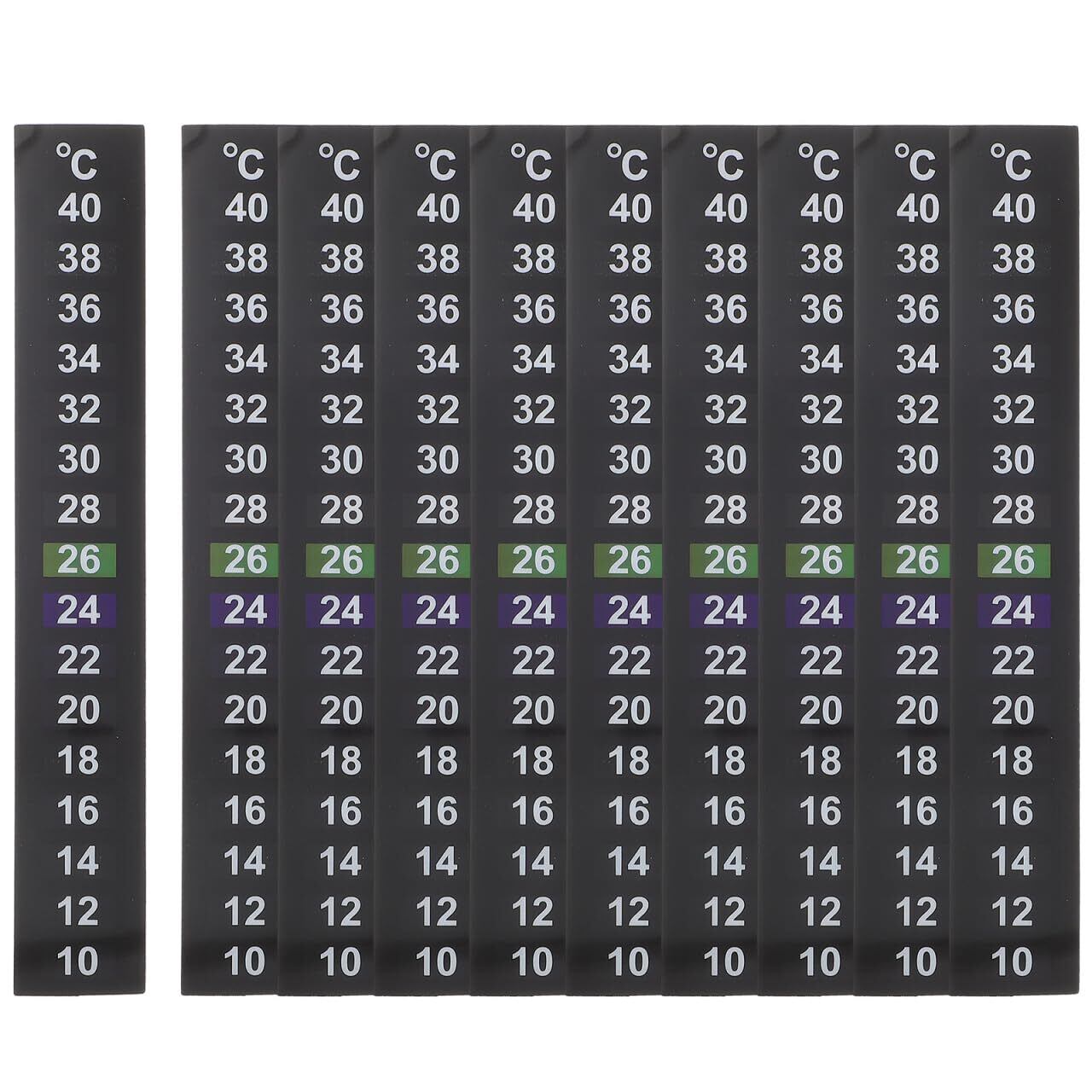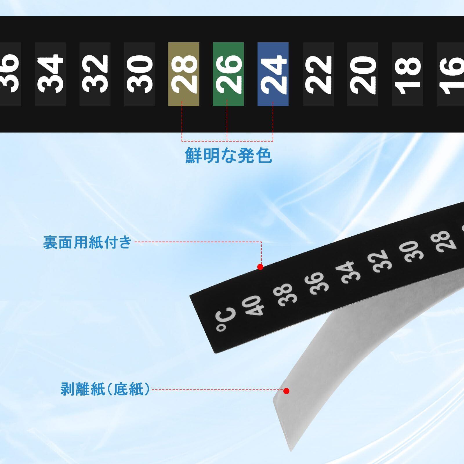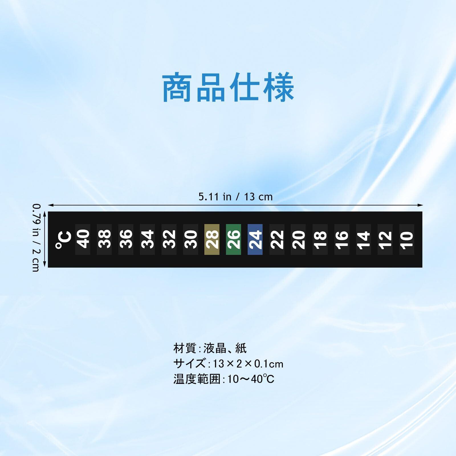 【製品仕様】サイズ:13.00×2.00×0.10cm/測定範囲:10-40℃/材質:液晶フィルム・紙/内容:水温測定シール10枚。