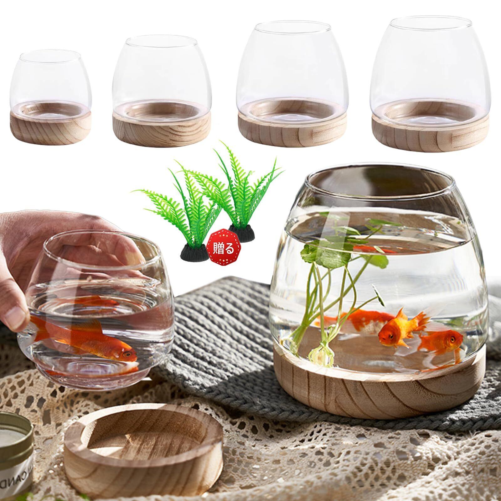 金魚鉢 ガラス 丸 金魚 水槽 小さい メダカ水槽 観葉植物 インテリア テーブル アクアリウム ボウル 水培 大容量 おしゃれ 飼育容器 小型 メダカ飼育鉢 透明小さな水族館 人工水草付き (L: 15*10CM)