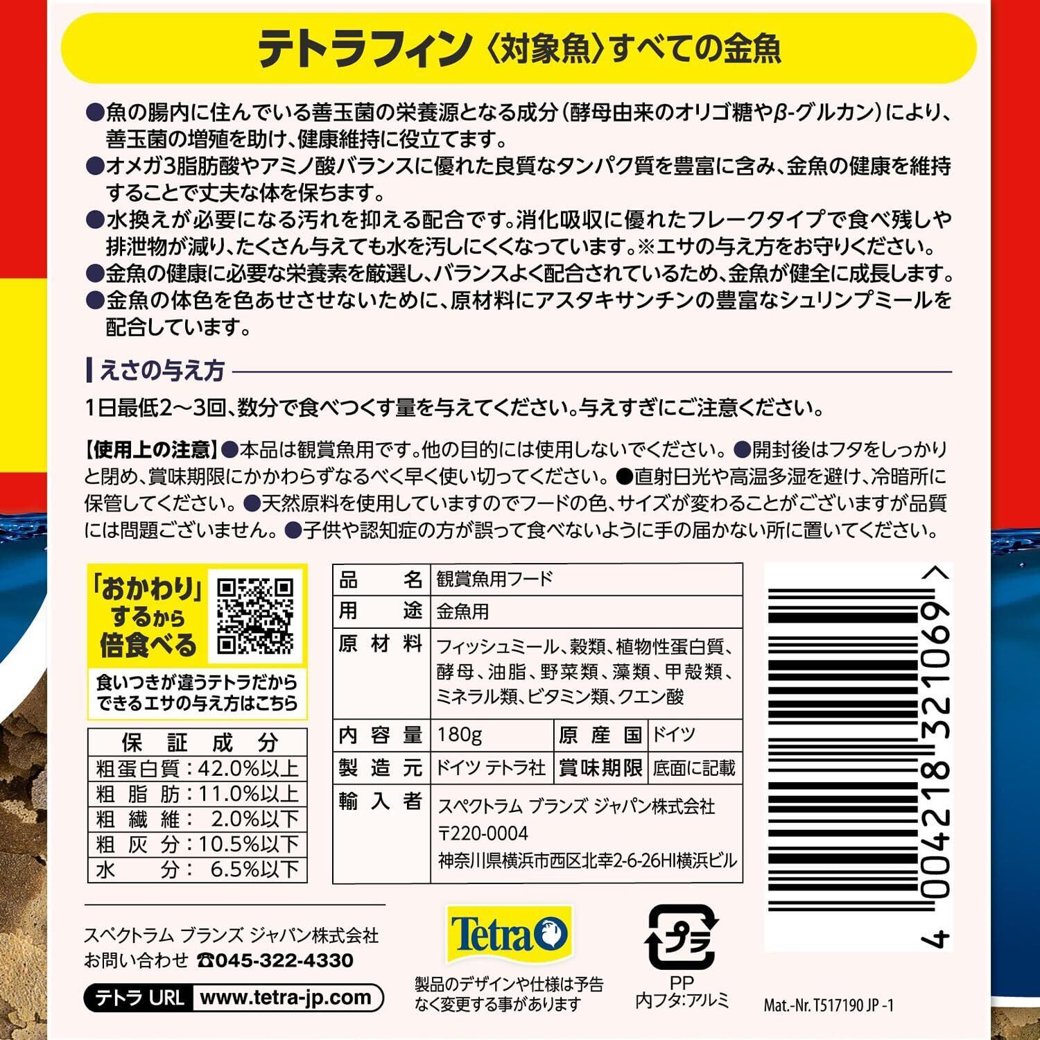 テトラ(Tetra) テトラフィン 180G 金魚の餌 善玉菌の増殖を助けて 糞を分解 ニオイも汚れも抑えるフード 天然原料のみ使用の安心フード 着色料 保存料 不使用 水をキレイに保つ 食いつき特化 おかわり給餌