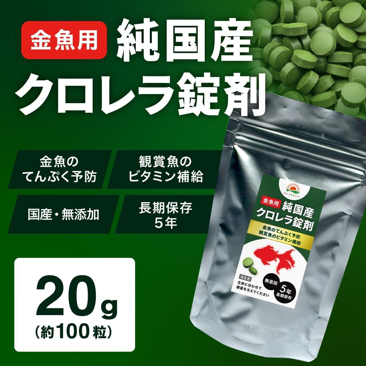 おひさまめだか 純国産 観賞魚用 クロレラ錠剤 20g(約100粒) 比較実験で実証!鮮やかな緑が続く高栄養タイプ 金魚 メダカ プレコ エビ ビーシュリンプ 餌 整腸効果 転覆病予防 日本製