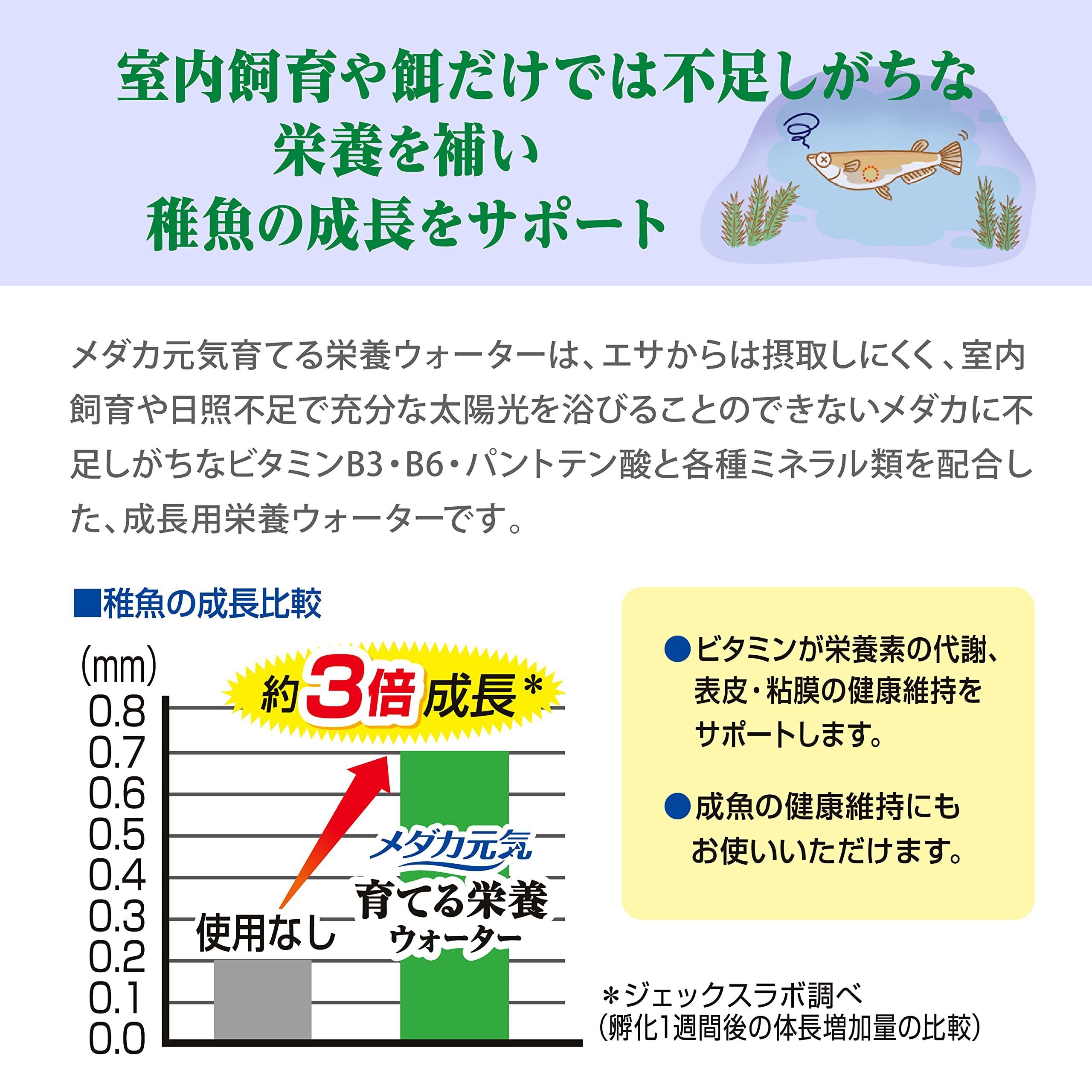 本製品は、餌から摂取しにくく、室内飼育や日照不足で充分な太陽光を浴びることのできないメダカに不足しがちなビタミンB3・B6・パントテン酸と各種ミネラル類を配合した、成長用栄養ウォーターです。