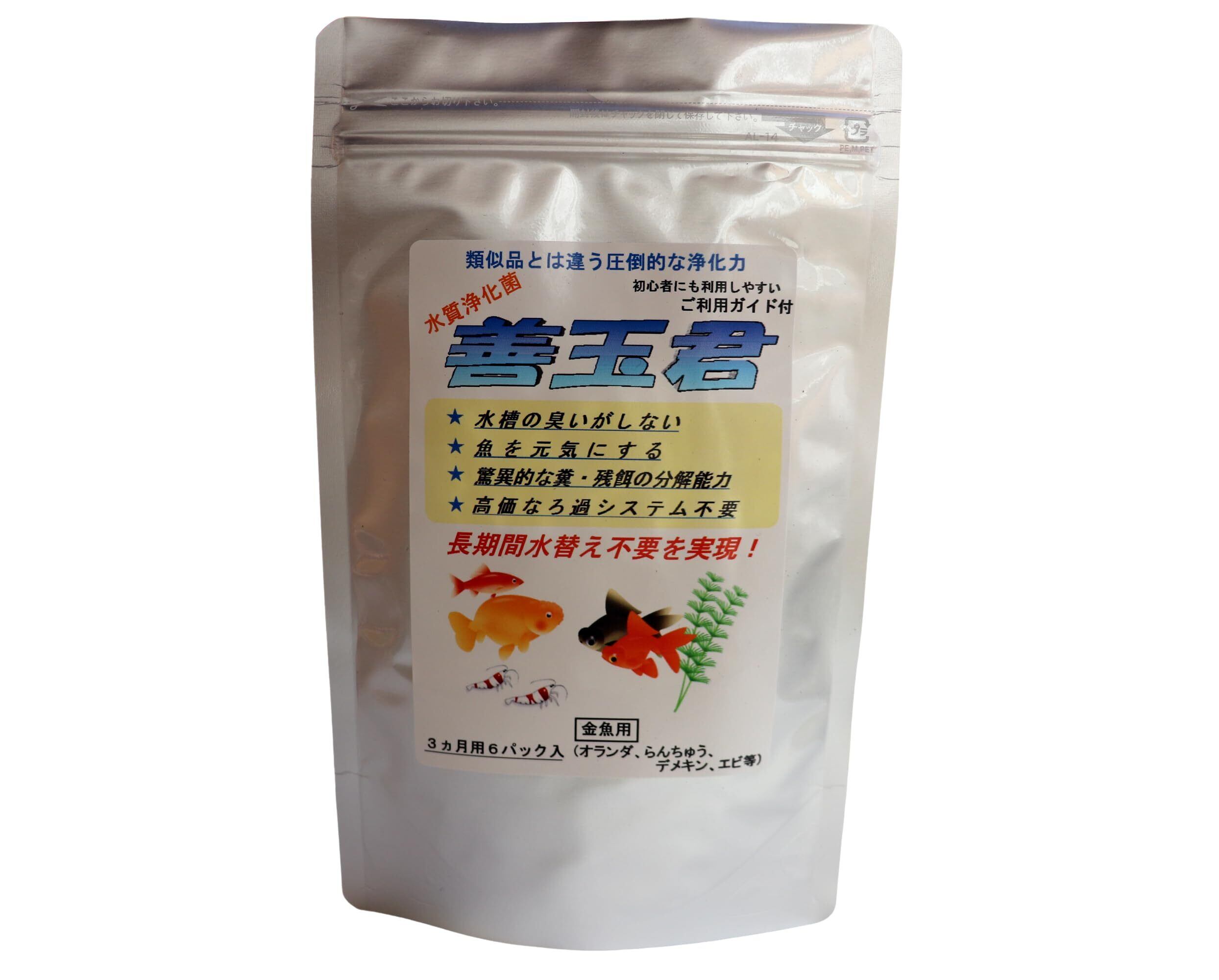 善玉君粉パック金魚用3ヵ月分:6パック入っています。 小袋に2個ずつ封入。 60cm水槽(水量約60リットル)に対し、1パックを水面に浮かべるだけで、水替えを軽減でき、臭いや魚の病気を予防できる。