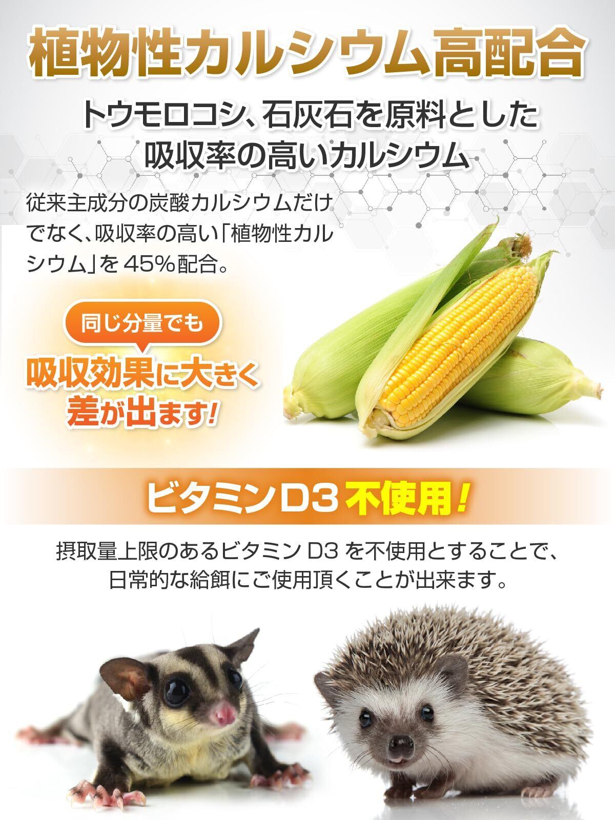 【 ビタミンD3はあえて不使用 】ビタミンD3をあえて加えていないことで、紫外線(UVB)をしっかり当てている子や、D3入り製品を別で使っている場合でも使いやすくなっています。過剰摂取の心配がなく、飼育スタイルに合わせて自由に調整できるのが大きなメリットです。