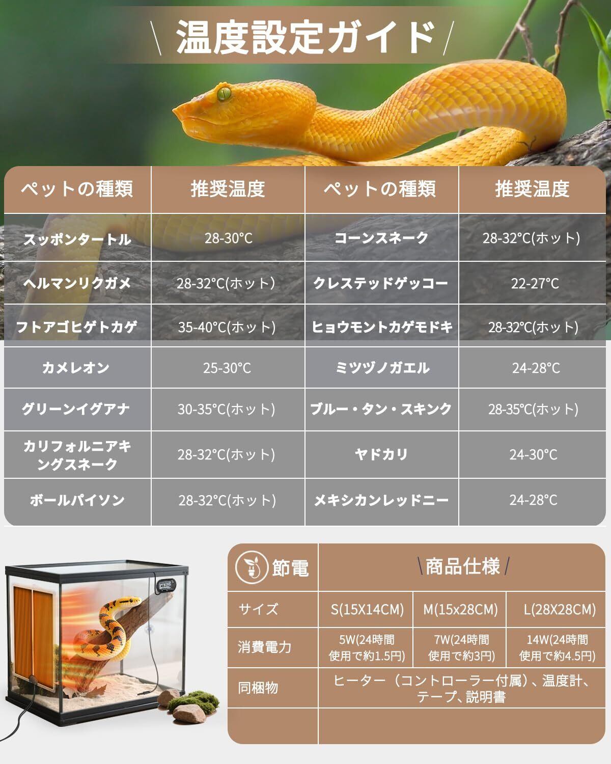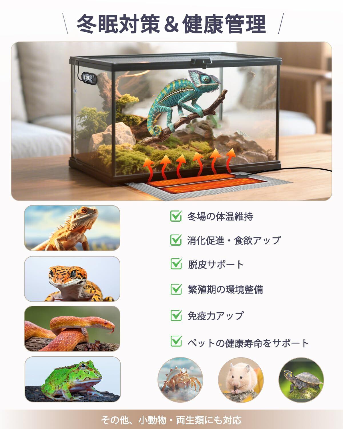 【広範な生物対応 & 安心の】クレステッドゲッコー、ヒョウモントカゲモドキ、コーンスネーク、フトアゴヒゲトカゲ、ツノガエルなど、多種の爬虫類・両生類・小動物の体温維持、消化促進、脱皮サポートに。万一、品質に不具合があった場合は、無償交換または返金にて対応いたします。