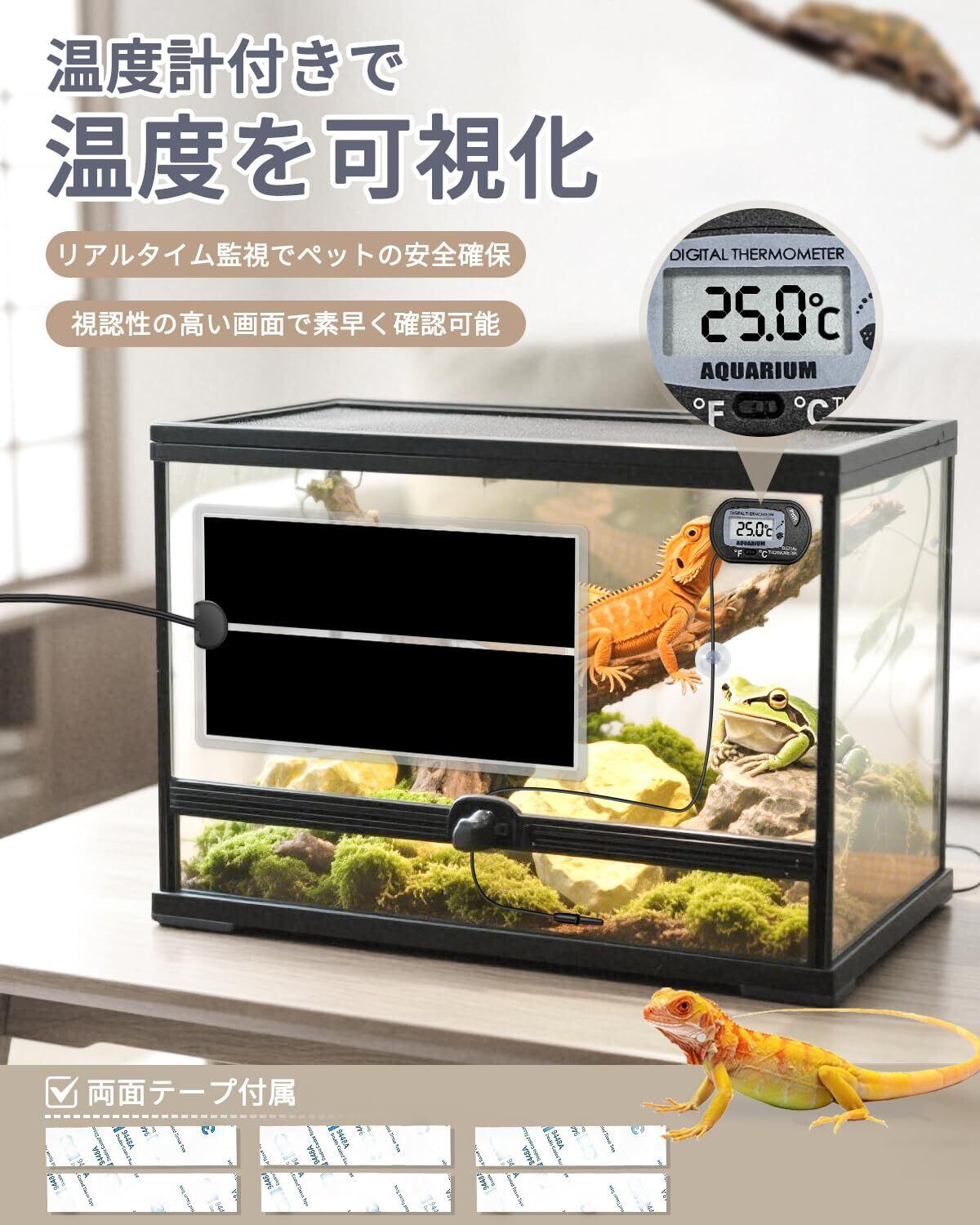 【安心の可视化温度管理】当社の爬虫類 ヒーターはデジタル温度計付属。プローブをケージ内に設置するだけで、加热パッドの温度をリアルタイムで確認でき、过热や异常を未然に防止。愛寵の安全を守るため、初心者でも安心して使用できる設計です。