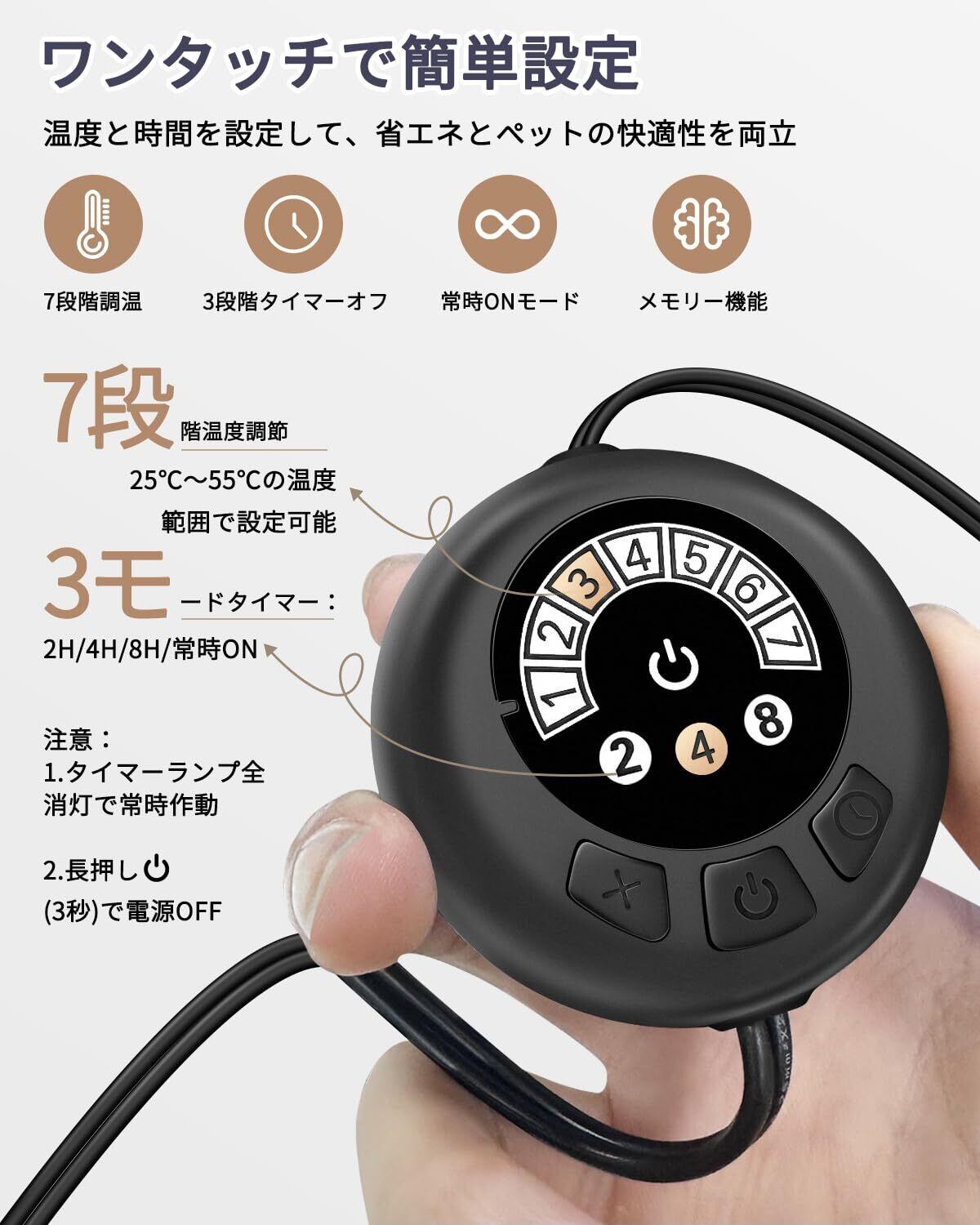 【7段階の温度調節】爬虫類 パネルヒーターながら、7段階の温度調節が可能。環境温度に応じて+3℃~+25℃の範囲で設定でき(つまり25℃~55℃)、睫角守宮の低温から鬣獅蜥の高温まで、各種爬虫類の生態にぴったりの快適環境を簡単に構築できます。記憶機能付きで、毎回の設定も不要。