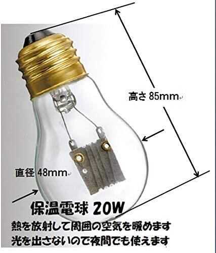 別売「保温電球カバー付 20W HD-20C」の交換用電球としてご使用ください。熱を放射して周囲の空気を暖める電球型のヒーターです。ケージや飼育容器全体を暖め、寒い季節も安心してペットを飼育できます。電球の表面には特殊コーティングが施されており、割れにくく、破損時の飛散を防ぎます。簡単に取り付けられるフック付きです。ペットが誤ってコードをかじってしまわないように、保護コイルを取りつけました。水槽(W60xD45xH45cm)に取り付けた場合の温度の目安は「室温+4度」です。