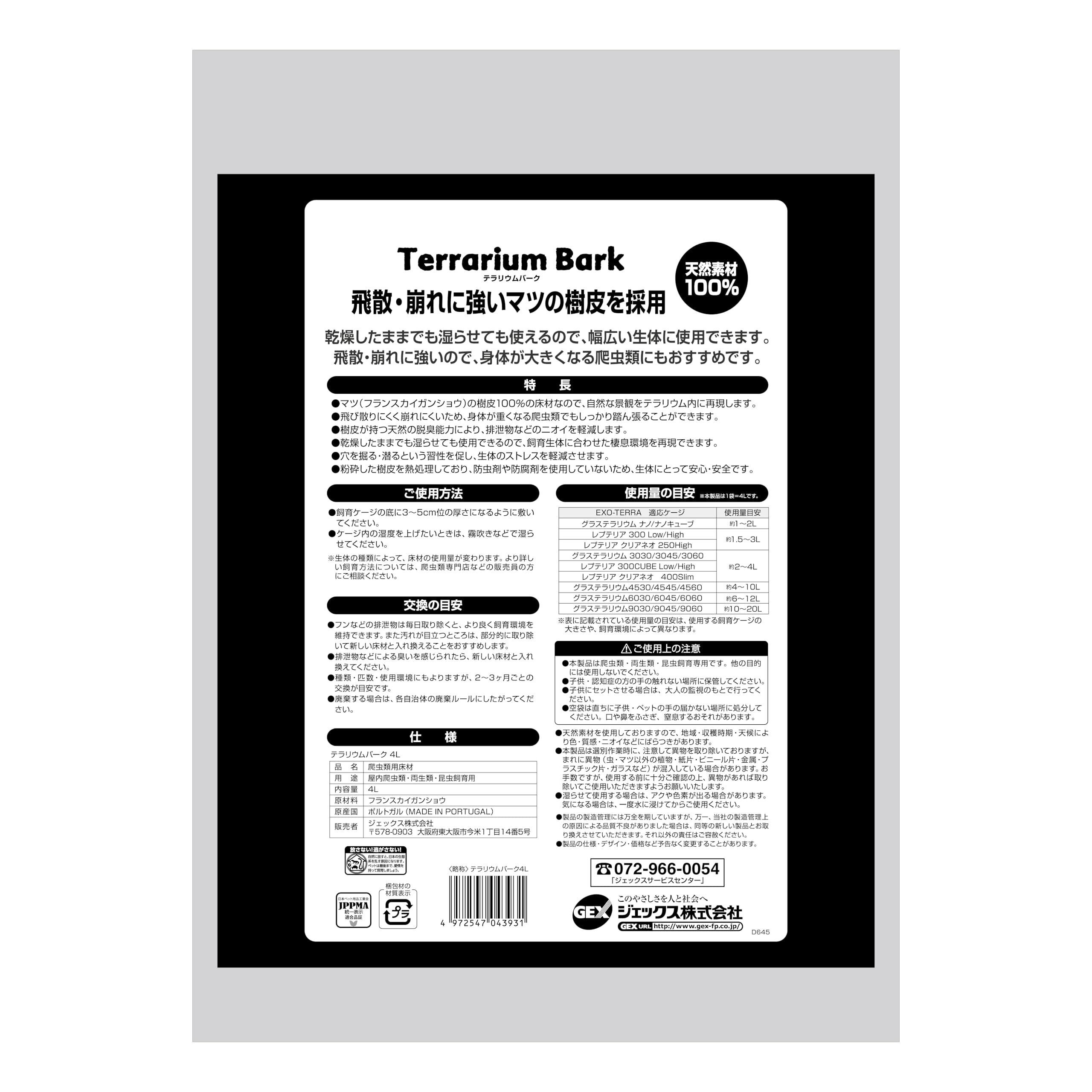 飛散・崩れに強いマツの樹皮を採用した床材 身体が大きくなる生体におすすめ! 樹皮の脱臭能力で排泄物のニオイを軽減。乾燥したままでも湿らせても使用できるので、飼育生体に合わせた棲息環境を再現できます。 天然フランスカイガンショウ100% ●マツ(フランスカイガンショウ)の樹皮100%の床材なので、自然な景観をテラリウム内に再現します。●飛び散りにくく崩れにくいため、身体が重くなる爬虫類でもしっかり踏ん張ることができます。●樹皮が持つ天然の脱臭能力により、排泄物などのニオイを軽減します。●乾燥したままでも湿らせても使用できるので、飼育生体に合わせた棲息環境を再現できます。●穴を掘る・潜るという習性を促し、生体のストレスを軽減させます。●粉砕した樹皮を熱処理しており、防虫剤や防腐剤を使用していないため、生体にとって安心・安全です。 <ご使用方法>●飼育ケージの底に3-5cm位の厚さになるように敷いてください。●ケージ内の湿度を上げたいときは、霧吹きなどで湿らせてください。※生体の種類によって、床材の使用量が変わります。より詳しい飼育方法については、爬虫類専門店などの販売員の方にご相談ください。 <交換の目安>●フンなどの排泄物は毎日取り除くと、より良く飼育環境を維持できます。また汚れが目立つところは、部分的に取り除いて新しい床材と入れ換えることをおすすめします。●排泄物などによる臭いを感じられたら、新しい床材と入れ換えてください。●種類・匹数・飼育環境にもよりますが、2-3ヶ月ごとの交換が目安です。 <内容量>4L