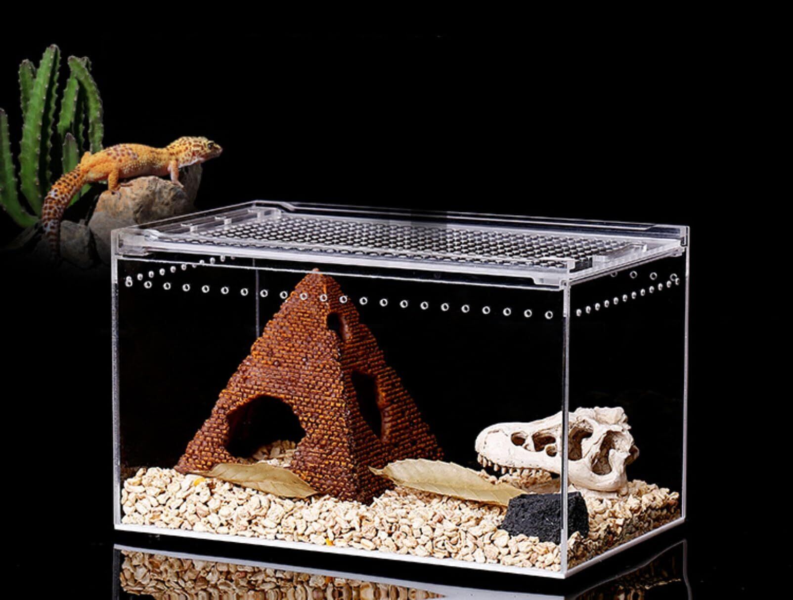 小さな通気孔が配置されており、優れた通気性を確保し、ペットの快適な環境を提供します。クモやサソリ、コオロギなど、さまざまな爬虫類の繁殖に最適な設計です。