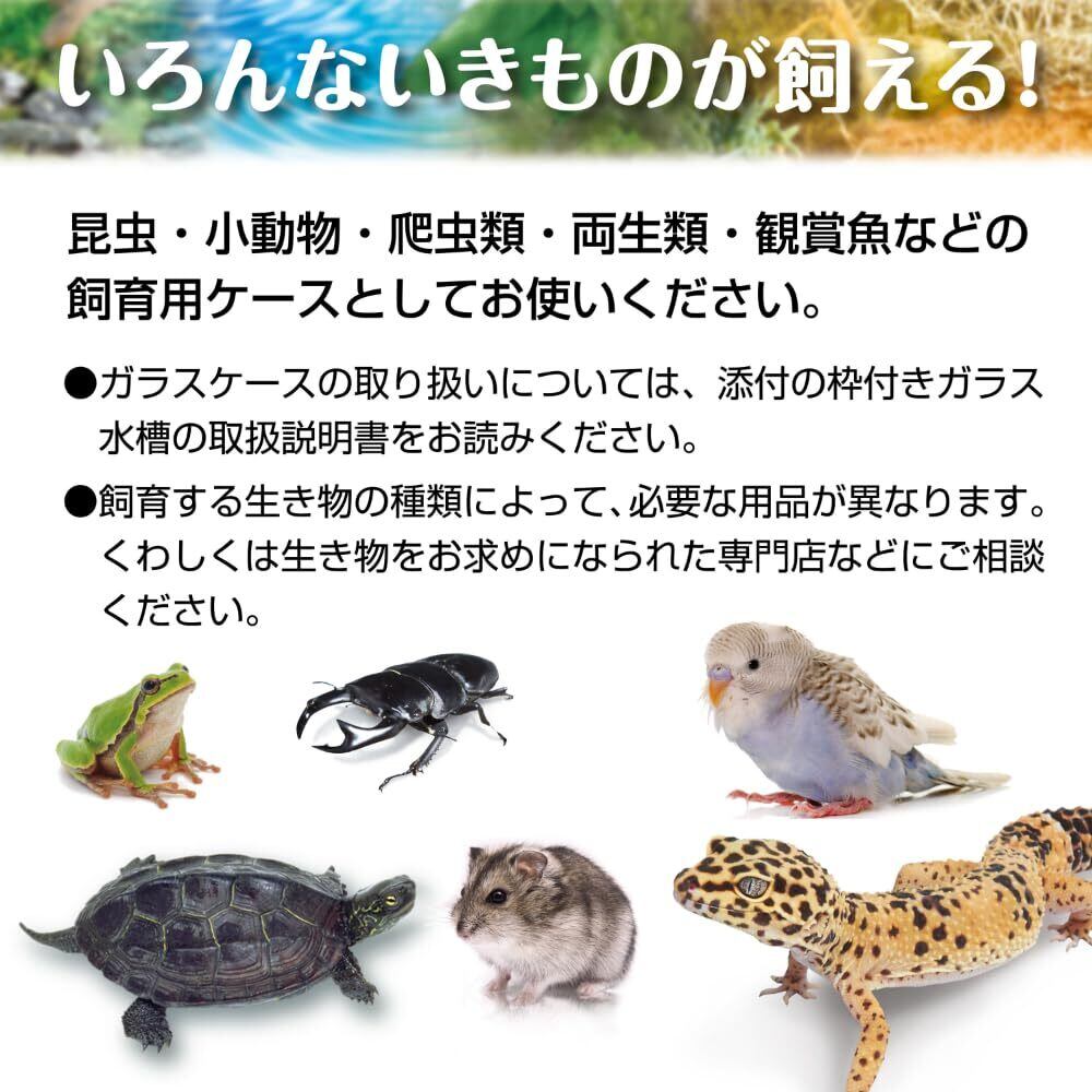 昆虫・小動物・爬虫類・両生類・観賞魚などの飼育用ケースとしてお使いください。●ガラスケースの取り扱いについては、添付の枠付きガラス水槽の取扱説明書をお読みください。●飼育する生き物の種類によって、必要な用品が異なります。くわしくは生き物をお求めになられた専門店などにご相談ください。 【カバーの取り付け方】●カバー後方のツメ(左右2ヶ所)をガラスケースのフレームにはめます。●カバー前面の固定フック(左右2ヶ所)をカチッと音がするまで押してロックします。※固定フックでカバーがしっかりとロックされているか必ず確認してください。 【小窓の開閉】ロックを左右どちらかに回すとロックが解除されます。小窓を閉じた後は、必ずロックを回して小窓をロックしてください。 【コード穴の開け方】切り欠き部を折って取り外すことで、コード穴を開けて電源コードやチューブを通すことができます。※一度開けると閉じることはできません。※開けた後は、小型の生き物が脱走しやすくなりますのでご注意ください。※切り欠き部を折る際は、ケガをしないように注意してください。 ●生き物の種類や大きさによっては、コード穴や隙間(最大3×30mm)に顔や体を挟みケガをするおそれがあります。また、脱走するおそれがありますので使用中は十分に注意してください。●小窓のメッシュ部分は、霧吹きなどで水がかかった場合、腐食することがあります。●UVランプを使用した場合、変色・劣化する場合があります。●ランプはケージ内では使用しないでください。ケージの外で使用する場合、ランプを樹脂部分に近づけすぎると変形するおそれがありますのでご注意ください。