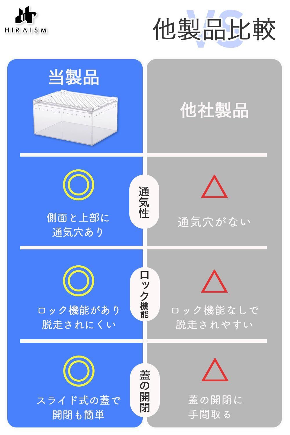 【クリアな視界と使いやすさ】高透明度アクリルを使用しており内部の様子をはっきりと観察できるので、ペットの健康状態もチェックがしやすいです。スライド式の蓋で開閉も簡単なため、給餌や掃除の際もスムーズです。脱走防止機能もあり家を空ける留守の際の飼育にも◎