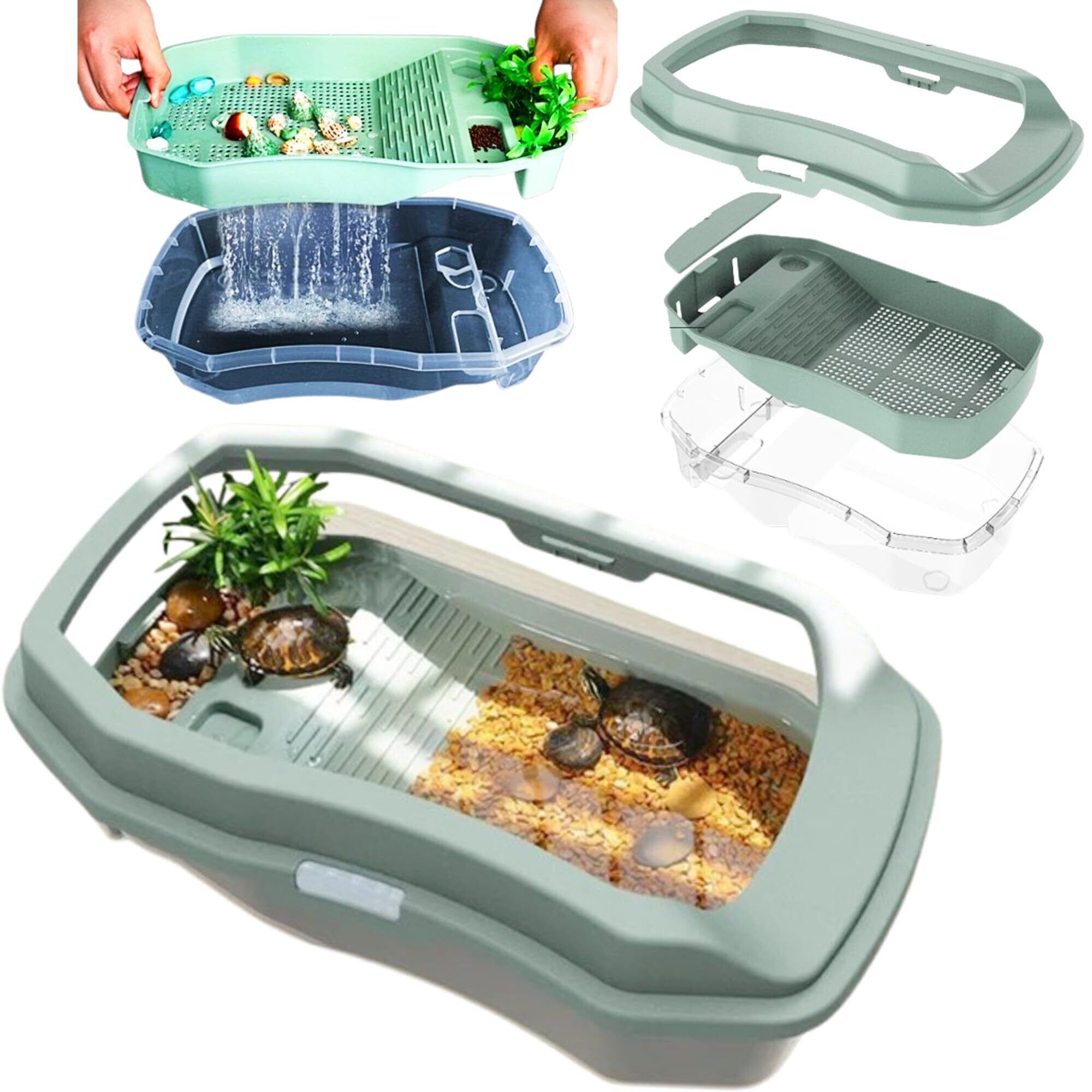 【簡単にお掃除できる三層構造】三層構造によって、お掃除がとても簡単になります。底部受け皿にたまった亀のフンも、サッと取り除けるので、手間をかけずにいつでも清潔な状態を保つことができます。忙しい日常でもストレスフリーにお手入れができ、亀のために理想的な環境を提供できます。