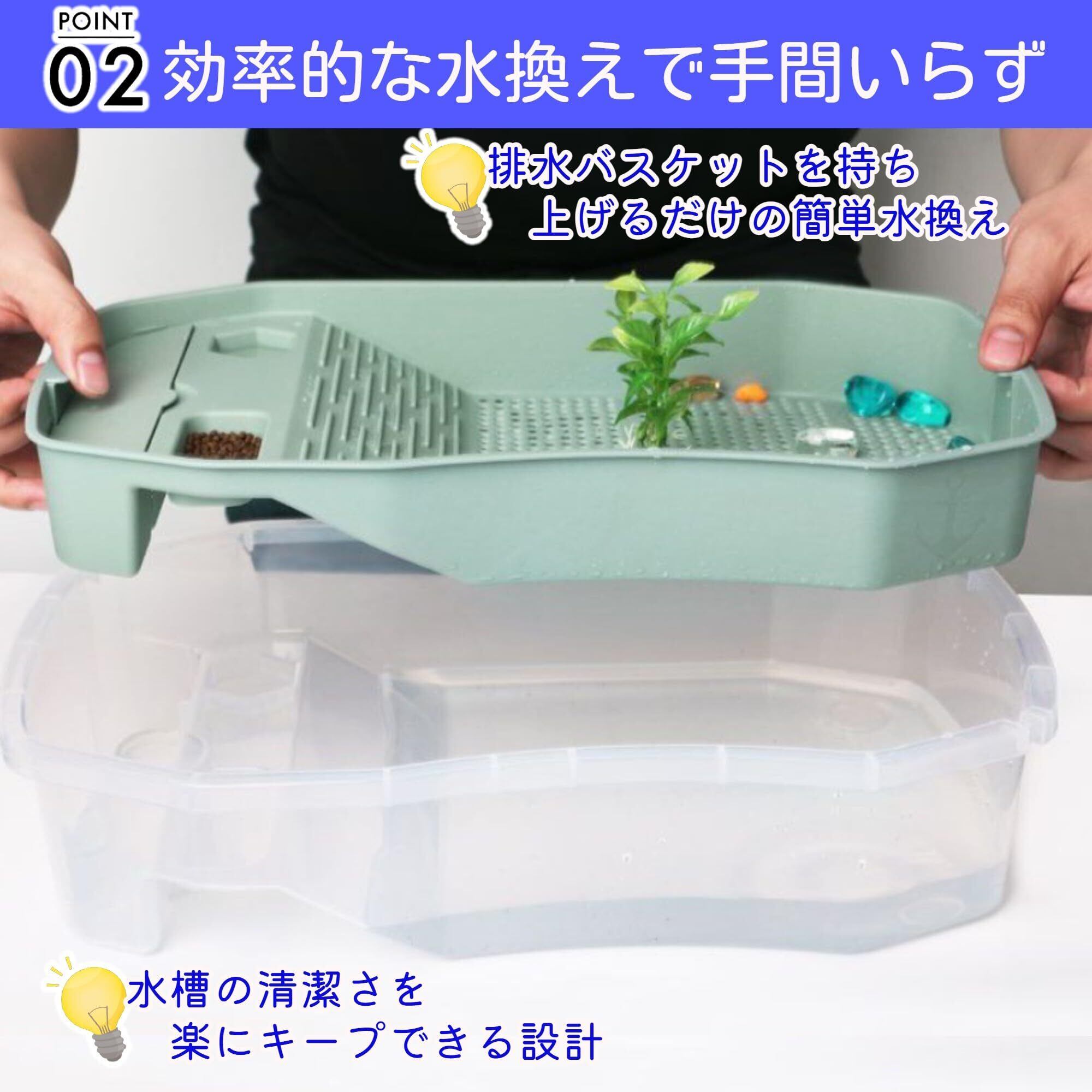【簡単にお水の交換ができる】水換えの手間を大幅に軽減できる設計です。排水バスケットを軽く持ち上げるだけで、スムーズにお水の交換ができるので、手間なく清潔な飼育環境を維持できます。亀との楽しい時間をより快適に過ごすための工夫が施されています。