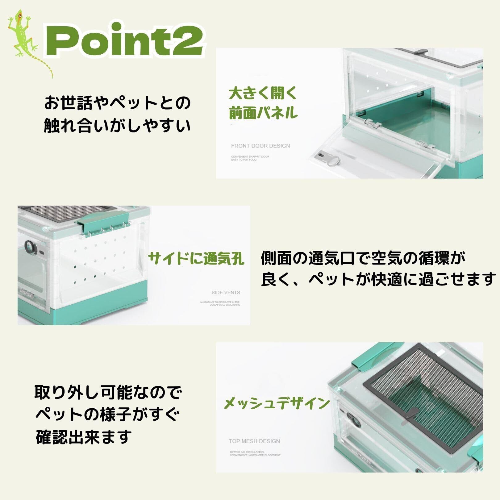 【通気性抜群】側面には多数の通気穴、天面には取り外し可能なメッシュ蓋を採用。空気の流れをしっかり確保し、ペットの快適性も抜群です!※通気口等の小さな隙間から、Sサイズの餌用コオロギ等が脱走する可能性がありますのでご注意下さい。