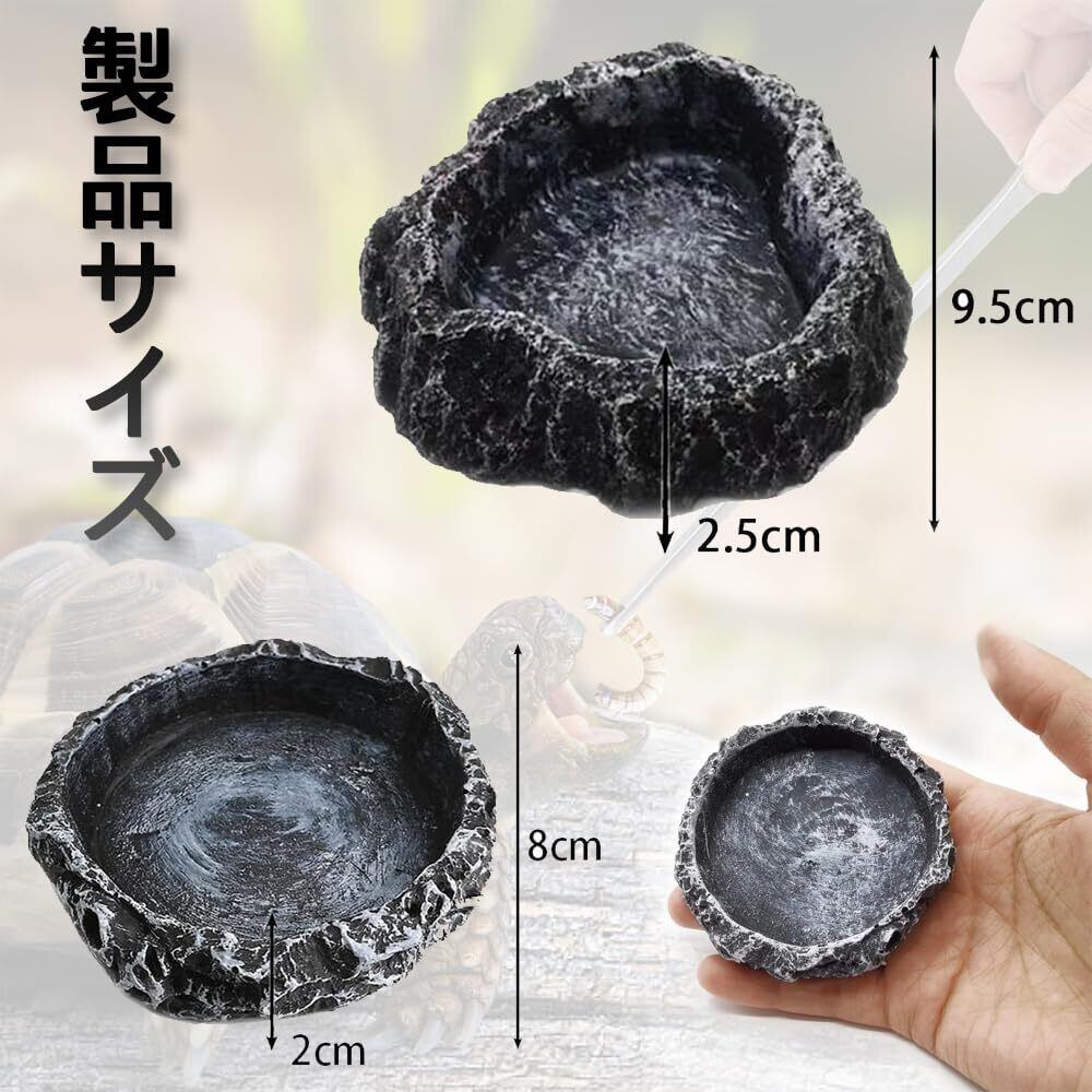 【製品仕様】ペット用飼育皿2個セット。サイズはそれぞれ約8×8×2cm、9×8×2.5cmです。 【素材と使い心地】樹脂製で、軽くて扱いやすく、汚れも落としやすい素材です。繰り返し使っても傷みにくいため、長くご利用いただけます。 【自然になじむデザイン】岩をモチーフにした素朴な風合いで、ケージ内の景観に自然に溶け込みます。機能的でありながら、見た目にもこだわったつくりです。 【餌やりと水飲みの両用に】えさ皿としても水皿としても使え、適度な重み(約180g)があるため、ペットが動かしても倒れにくい安定感があります。 【様々なペットに対応】トカゲやカメ、ヤドカリ、カエルなど、爬虫類や両生類のペットの飼育環境に幅広くお使いいただけます。