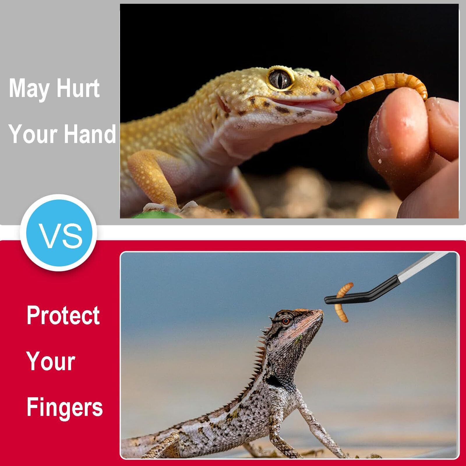 ゴム製の先端が付いた2つのタイプ:湾曲した爬虫類用給餌トングと直線の爬虫類用給餌トングはどちらも、しっかりとゴム製の先端が付いています。これらの給餌トングの先端は、餌をトングで噛むことが多い活発な爬虫類に餌を与えるときに特に便利です。口を怪我から守るのに役立ちます。