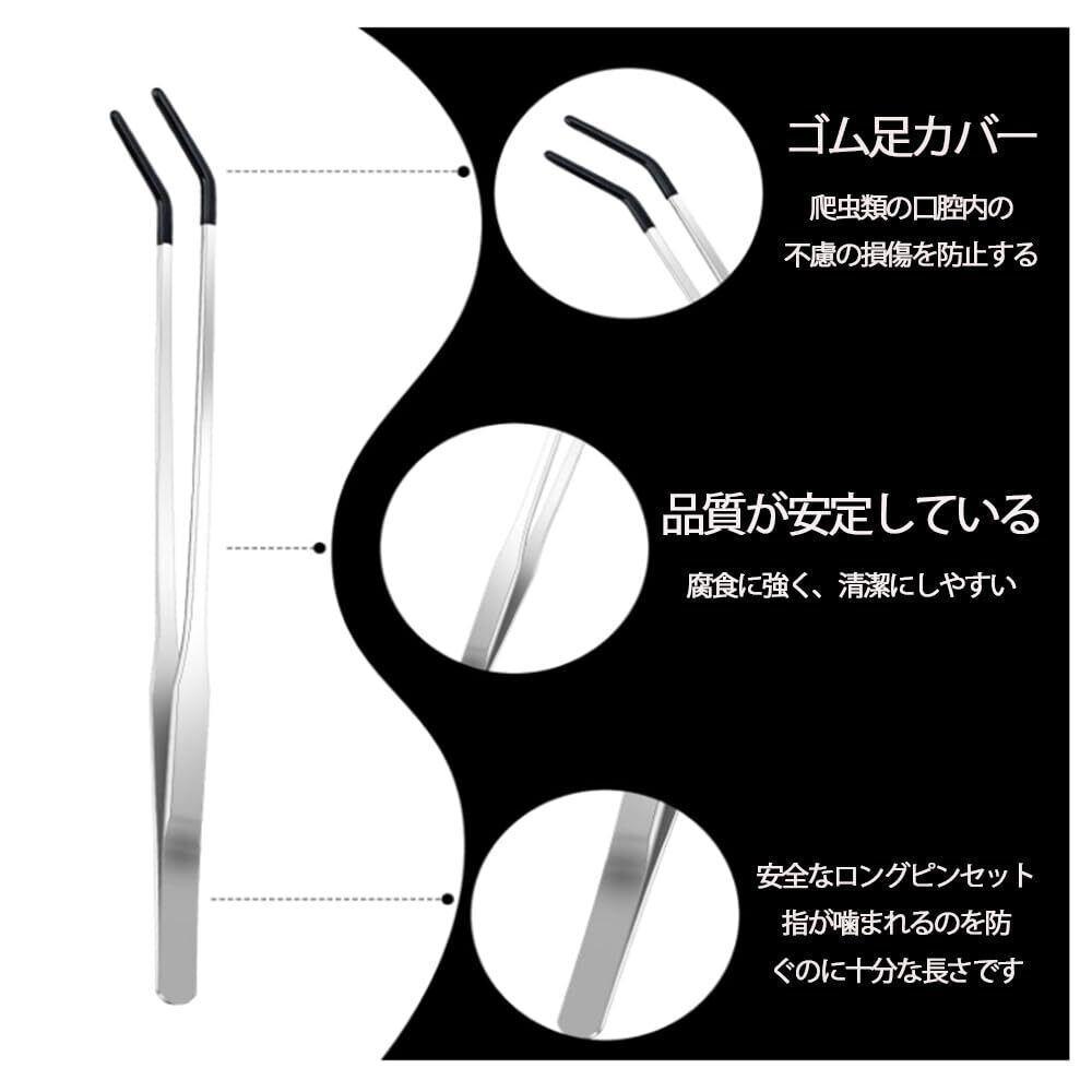 "1.【商品仕様】27 CMのストレートヘッドとエルボロングピンセット各1本、ブラックゴムヘッド付き。 2.【高品質ステンレス製】錆びにくいステンレス製で、長期間の使用に耐える丈夫さを備えています。メンテナンス後のお手入れが簡単で、水で洗い流し乾燥させるだけで清潔に保てます。 3.【便利な超ロング設計】約27cmの長さで、大型の水槽やテラリウムでも手を濡らさずに餌やりが可能。トカゲ、ヘビ、カメなどの飼育に最適です 4.【ゴム製の先端が付いた2つのタイプ】湾曲した爬虫類用給餌トングと直線の爬虫類用給餌トングはどちらも、しっかりとゴム製の先端が付いています。これらの給餌トングの先端は、餌をトングで噛むことが多い活発な爬虫類に餌を与えるときに特に便利です。口を怪我から守るのに役立ちます。 5.【多機能応用】トカゲ、ヘビ、カメなどの爬虫類の精確な餌やりに適しているだけでなく、虫、ミミズを挟み取り、水草、石などを処理するためにも使用でき、ペット飼育者と水族愛好家の実用的なツールである。"