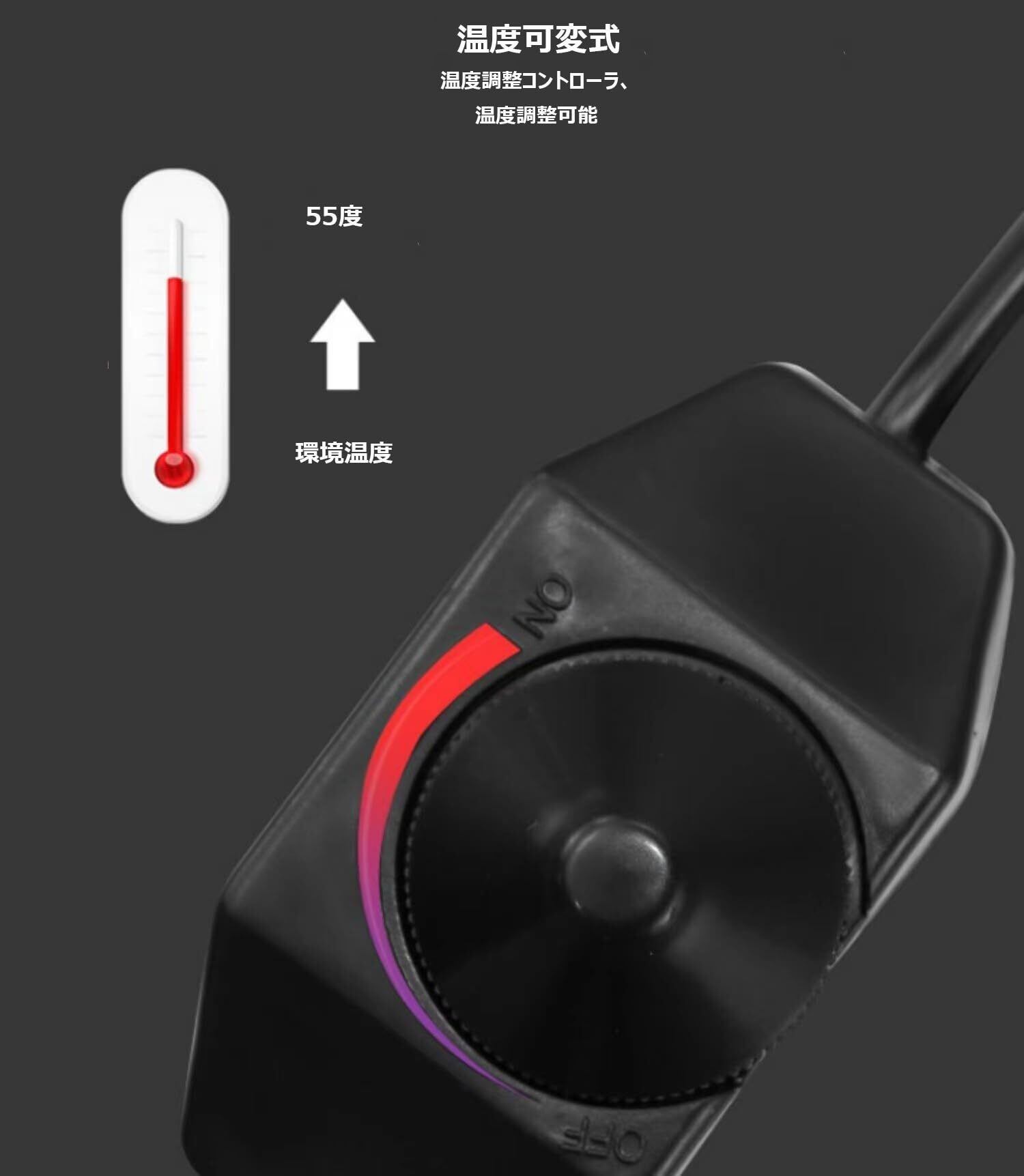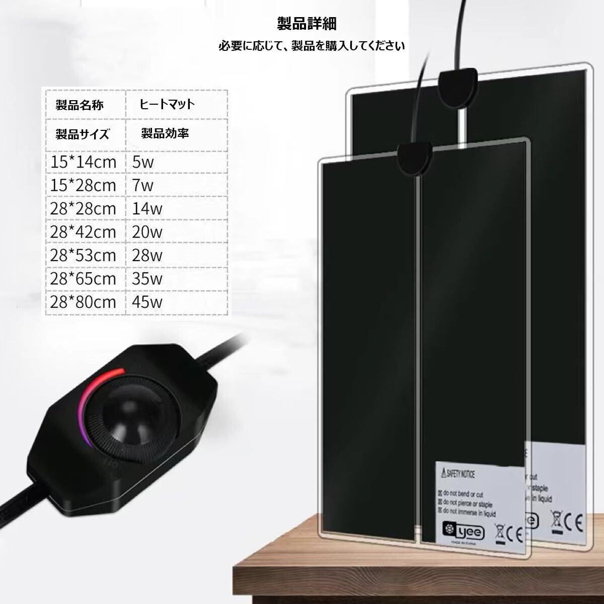 温度可変式 ヒートマット:ダイヤルを回すことで、目前の環境温度~45℃の範囲で好きな温度に設定できる自己温度制御式。爬虫類の種類や体調に合わせて、自由に温度設定ができる点が魅力の商品です。PS:温度表示機能が付いていないため、温度計と合わせて使用することをお勧めいたします。環境温度~45℃というのは環境温度が0℃の場合、パネルヒーターの温度が45℃まで達せられますが、環境温度が20℃の場合、パネルヒーターの温度が15℃までしか達せないのです。
