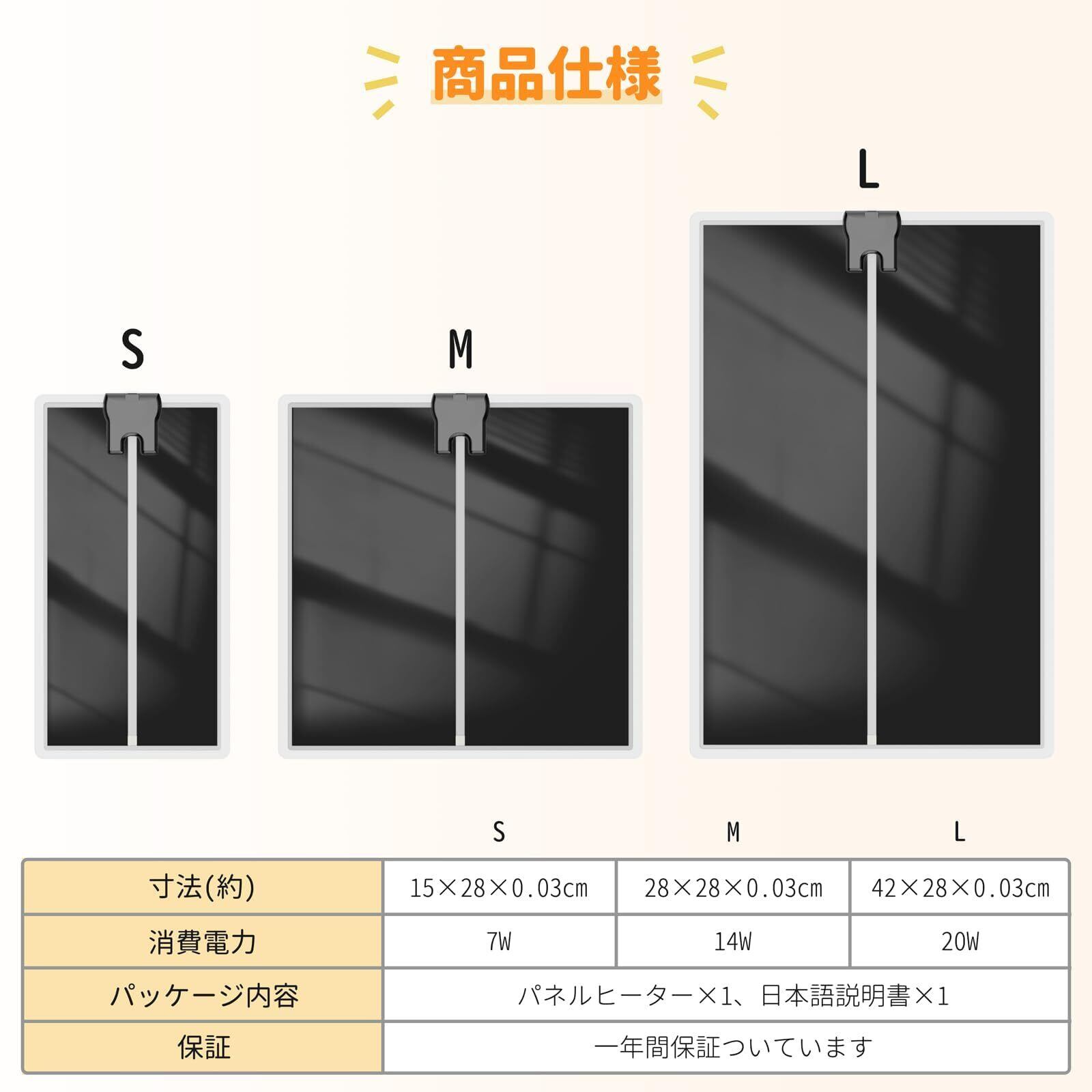 【三つのサイズが選択できます】S/M/L三つのサイズを用意しており、ご需要により様々な飼育ケージ幅広いに対応いただけます。ヒーターは低電力で省エネです。反射板や発泡スチロール箱、発泡スチロール板と組み合わせて使用すれば、さらにヒーター効果が良くなります。
