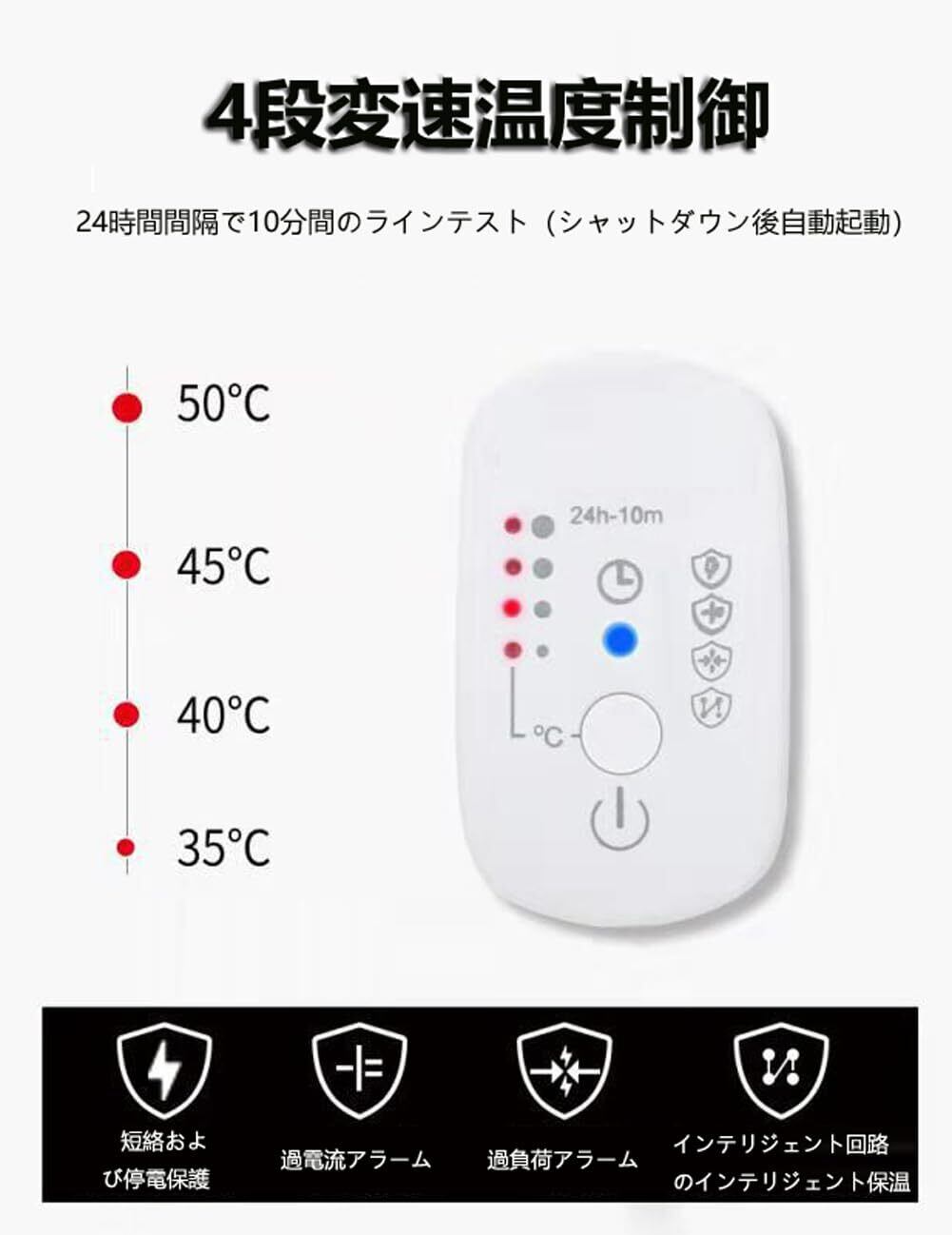 【警報装置】 加熱パッドは、24 時間ごとに 10 分間回路を自動的に検出します (シャットダウン後に自動的に開始されます)。短絡后は自働的に電源が切れて保護します。 加熱パッドの過電流と過負荷はアラームを鳴らします。