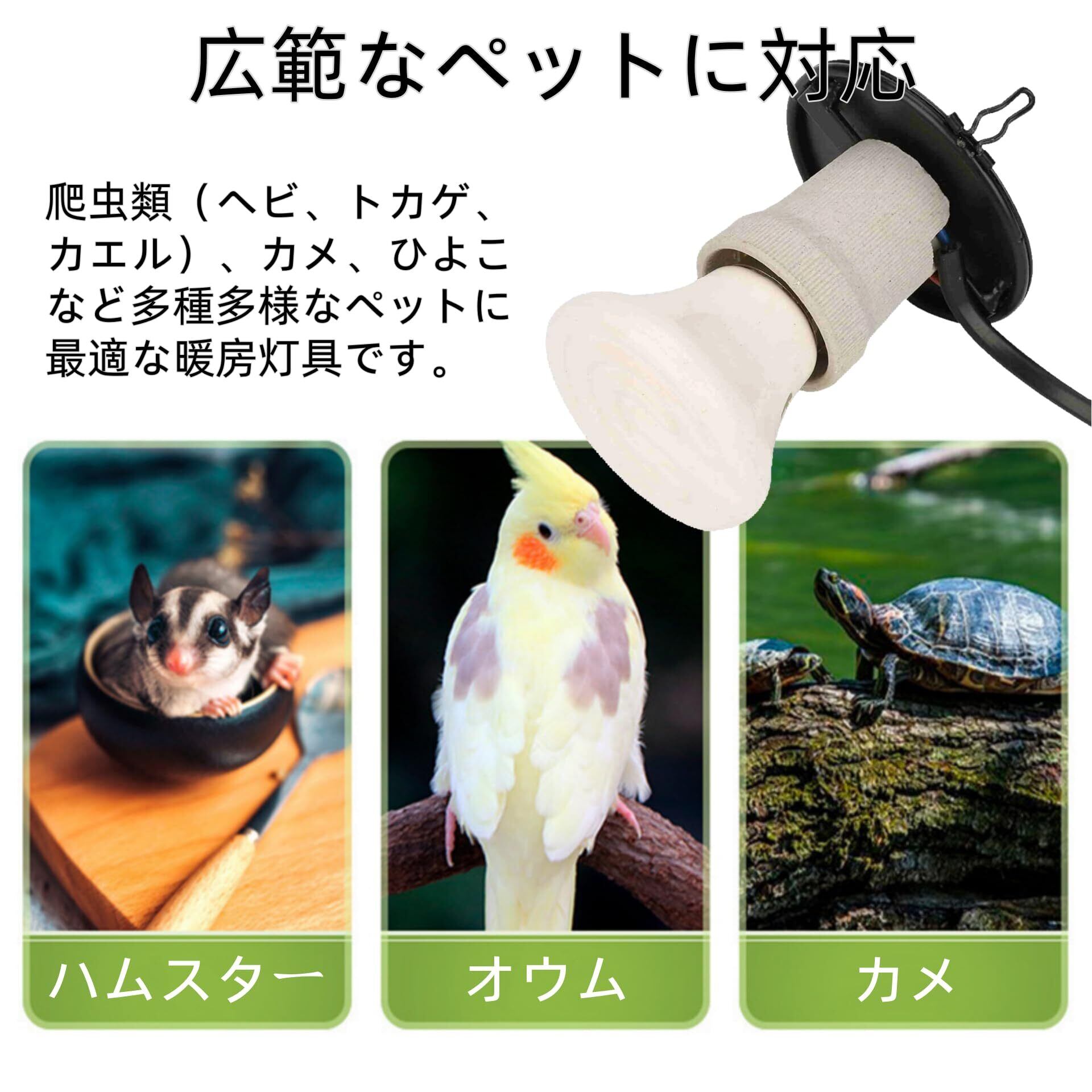 【広範なペットに対応】爬虫類(ヘビ、トカゲ、カエル)、カメ、ひよこなど多種多様なペットに最適な暖房灯具です。輸出級のセラミックヒーターを採用し、遠赤外線による速熱性を発揮し、ペットに快適な温度環境を提供します。