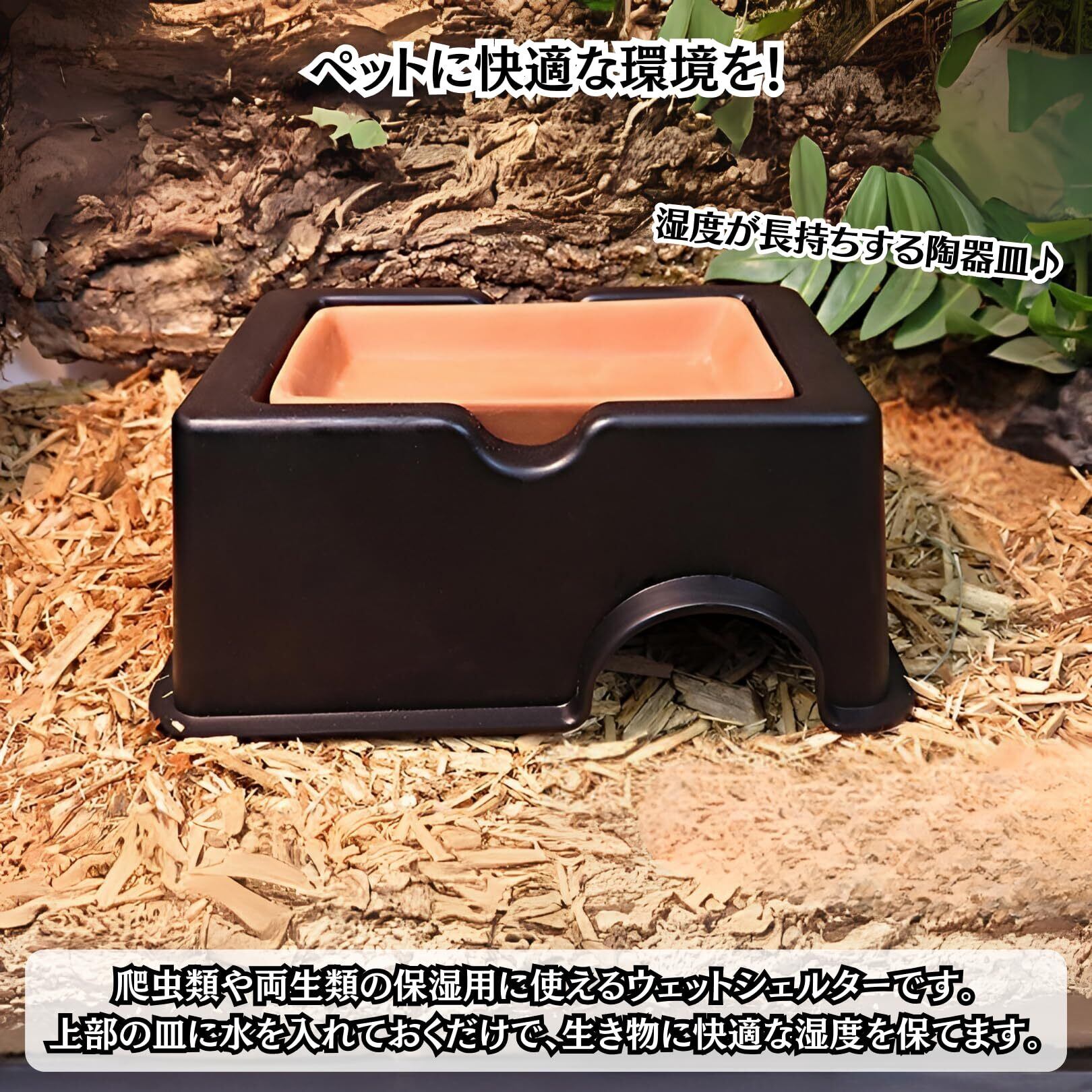【ペットに快適な環境を】トカゲ、ヤモリ、ヘビ等の爬虫類や両生類の保湿用に使えるウェットシェルターです。ボックス上部の陶器皿に水を入れておくだけでペットにとって快適な湿度を保つことができます。シェルター上部のスリットにより、陶器皿の取り外しがしやすい構造になっております。